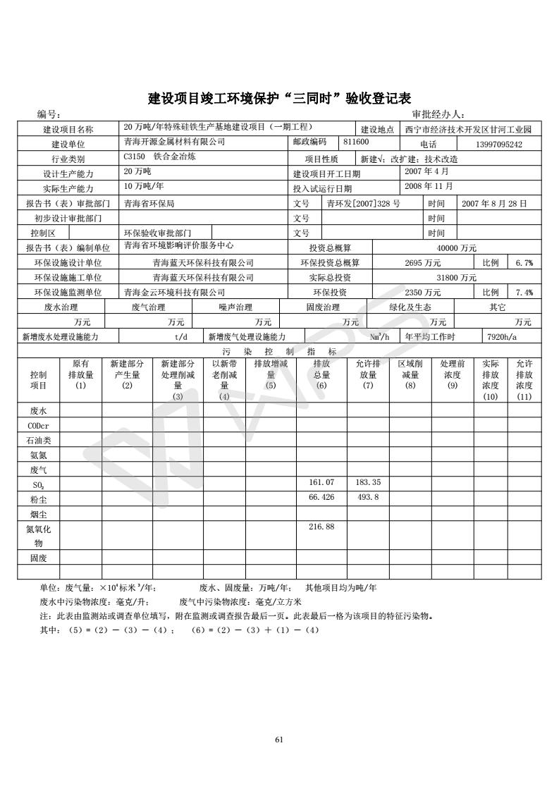 2018年1月11日,青海開源金屬材料有限公司組織召開20萬噸/年特殊硅鐵生產(chǎn)基地建設(shè)項(xiàng)目(一期工程)竣工環(huán)境保護(hù)驗(yàn)收會(huì)。 青海開源金屬材料有限公司20萬噸特殊硅鐵生產(chǎn)基地建設(shè)項(xiàng)目(一期工程)驗(yàn)收組意見.