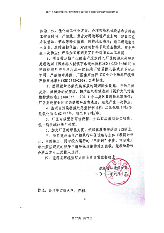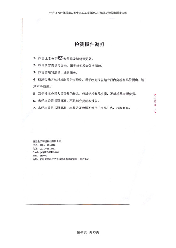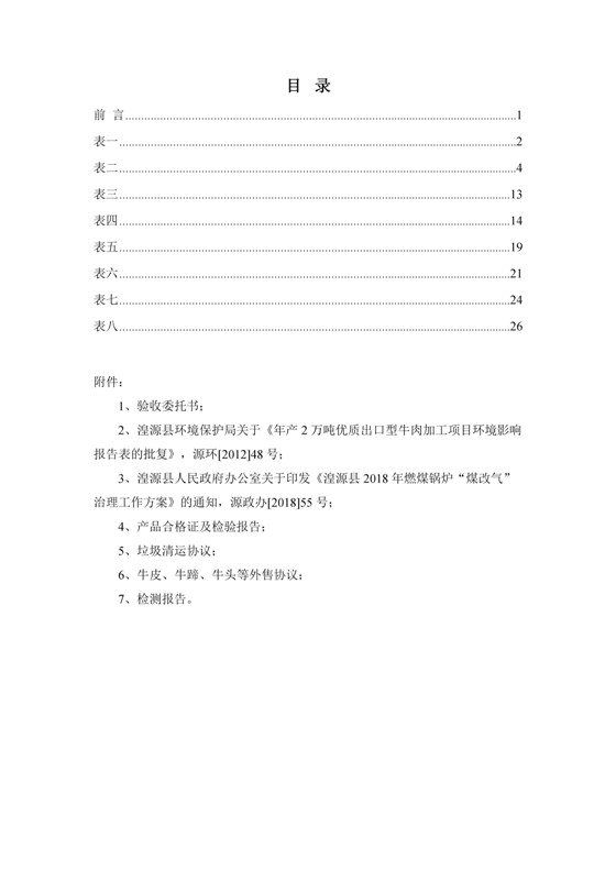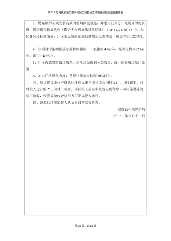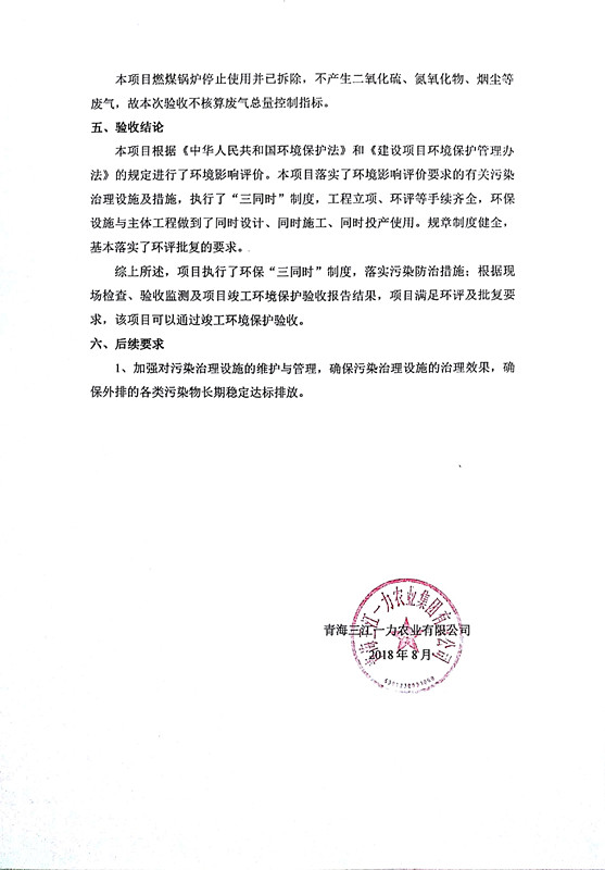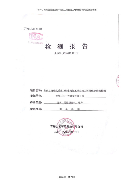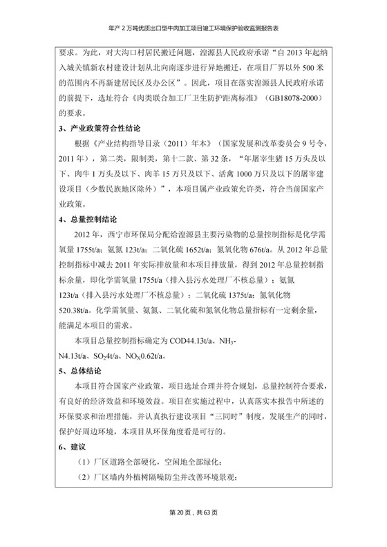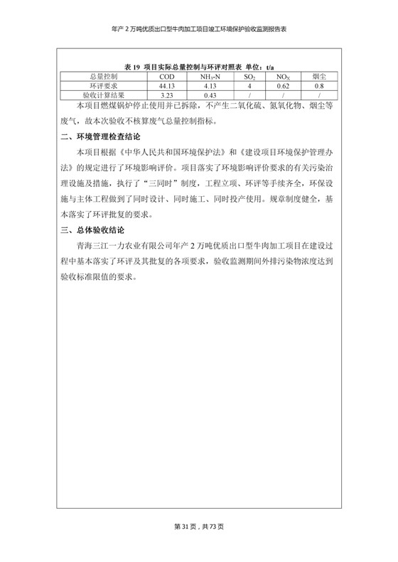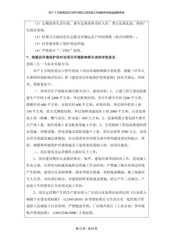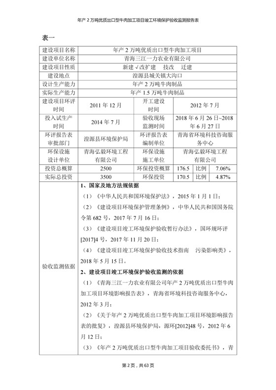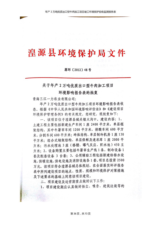 根據(jù)中華人民共和國(guó)國(guó)務(wù)院令第253號(hào)《建設(shè)項(xiàng)目環(huán)境保護(hù)管理?xiàng)l例》(中華人民共和國(guó)國(guó)務(wù)院令第682號(hào)《國(guó)務(wù)院關(guān)于修改〈建設(shè)項(xiàng)目環(huán)境保護(hù)管理?xiàng)l例〉的決定》和《建設(shè)項(xiàng)目竣工環(huán)境保護(hù)驗(yàn)收暫行辦法》,嚴(yán)格依照有關(guān)法律法規(guī),建設(shè)項(xiàng)目環(huán)境保護(hù)設(shè)施驗(yàn)收技術(shù)規(guī)范,本項(xiàng)目環(huán)評(píng)報(bào)告表和環(huán)保審批部門審批意見以及企業(yè)自行驗(yàn)收相關(guān)要求等對(duì)本項(xiàng)目進(jìn)行驗(yàn)收,本項(xiàng)目符合環(huán)保驗(yàn)收條件,可以通過環(huán)保驗(yàn)收。 青海三江一力農(nóng)業(yè)有限公司組織召開年產(chǎn)2萬(wàn)噸優(yōu)質(zhì)出口型牛肉加工項(xiàng)目(一期工程)驗(yàn)收組意見.