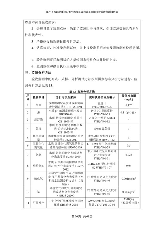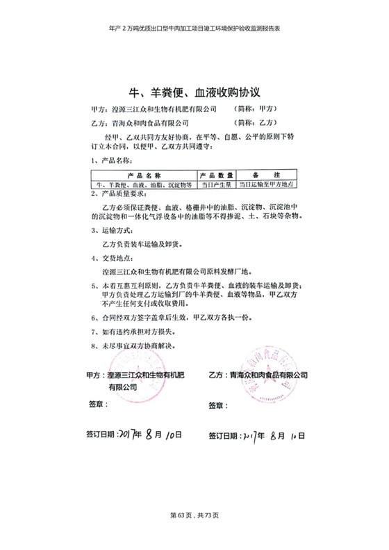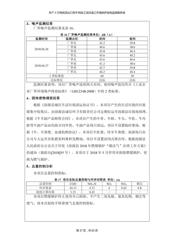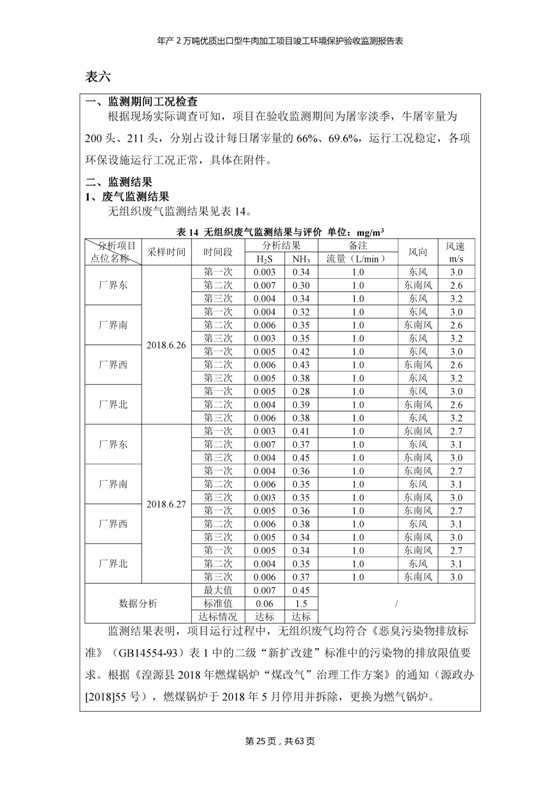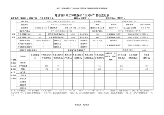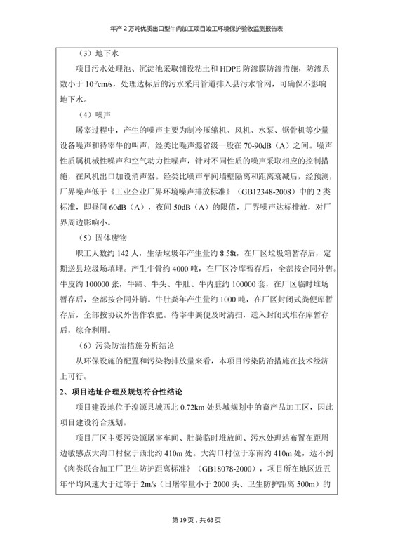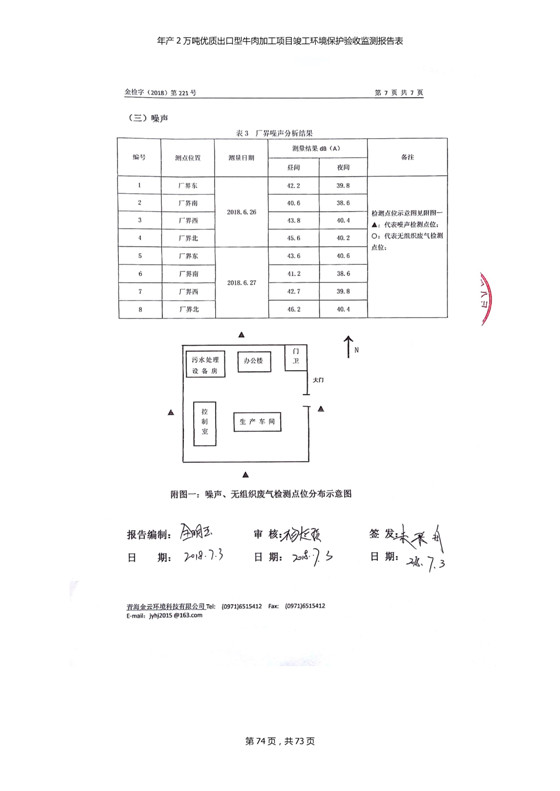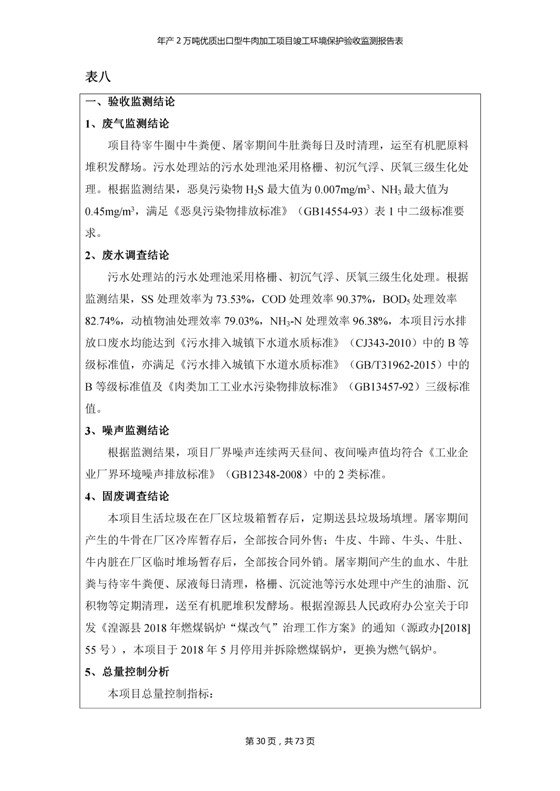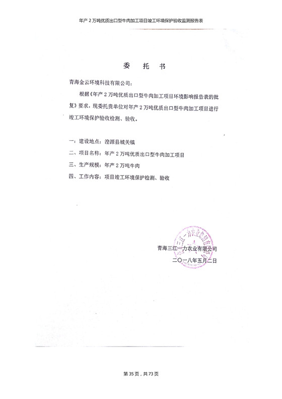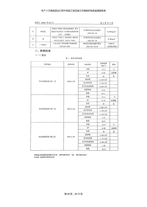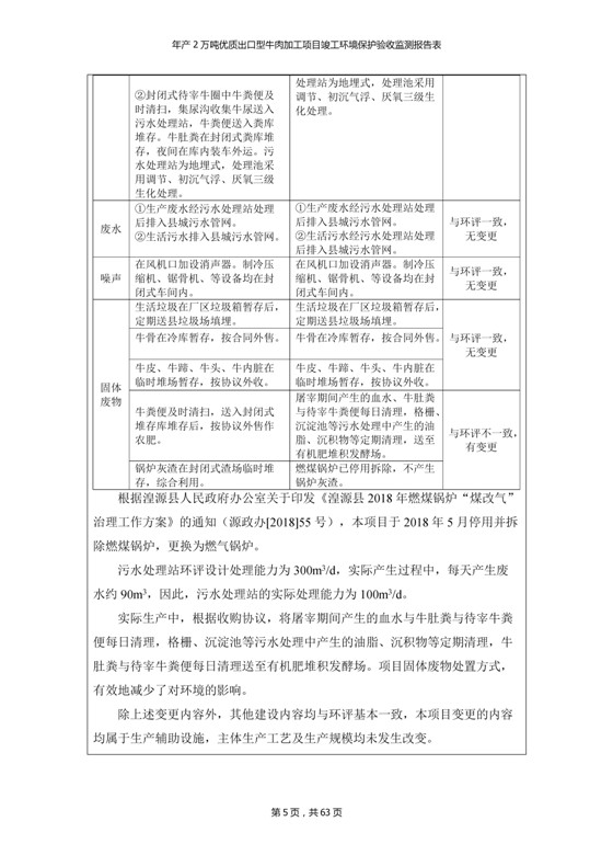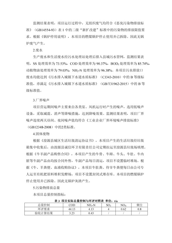 根據(jù)中華人民共和國(guó)國(guó)務(wù)院令第253號(hào)《建設(shè)項(xiàng)目環(huán)境保護(hù)管理?xiàng)l例》(中華人民共和國(guó)國(guó)務(wù)院令第682號(hào)《國(guó)務(wù)院關(guān)于修改〈建設(shè)項(xiàng)目環(huán)境保護(hù)管理?xiàng)l例〉的決定》和《建設(shè)項(xiàng)目竣工環(huán)境保護(hù)驗(yàn)收暫行辦法》,嚴(yán)格依照有關(guān)法律法規(guī),建設(shè)項(xiàng)目環(huán)境保護(hù)設(shè)施驗(yàn)收技術(shù)規(guī)范,本項(xiàng)目環(huán)評(píng)報(bào)告表和環(huán)保審批部門審批意見以及企業(yè)自行驗(yàn)收相關(guān)要求等對(duì)本項(xiàng)目進(jìn)行驗(yàn)收,本項(xiàng)目符合環(huán)保驗(yàn)收條件,可以通過環(huán)保驗(yàn)收。 青海三江一力農(nóng)業(yè)有限公司組織召開年產(chǎn)2萬(wàn)噸優(yōu)質(zhì)出口型牛肉加工項(xiàng)目(一期工程)驗(yàn)收組意見.