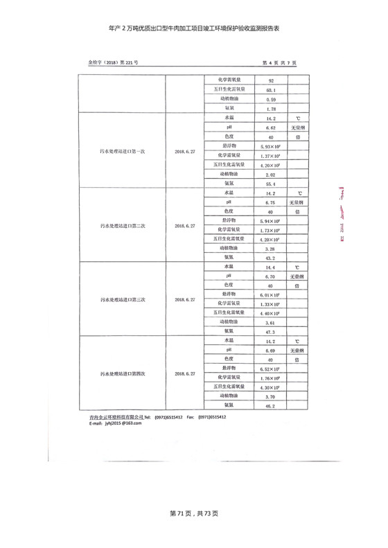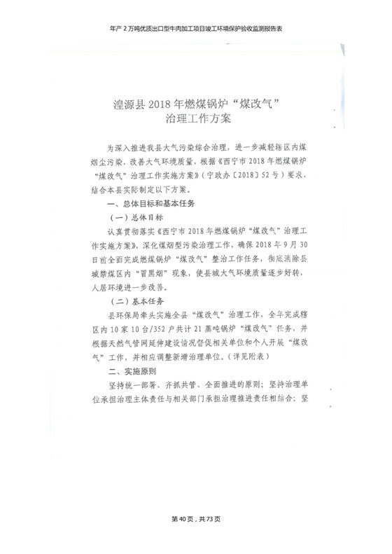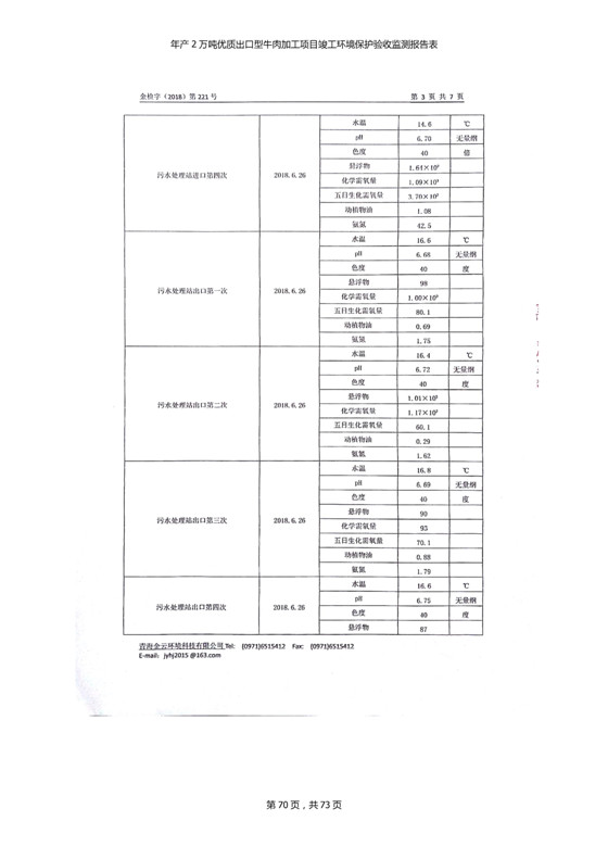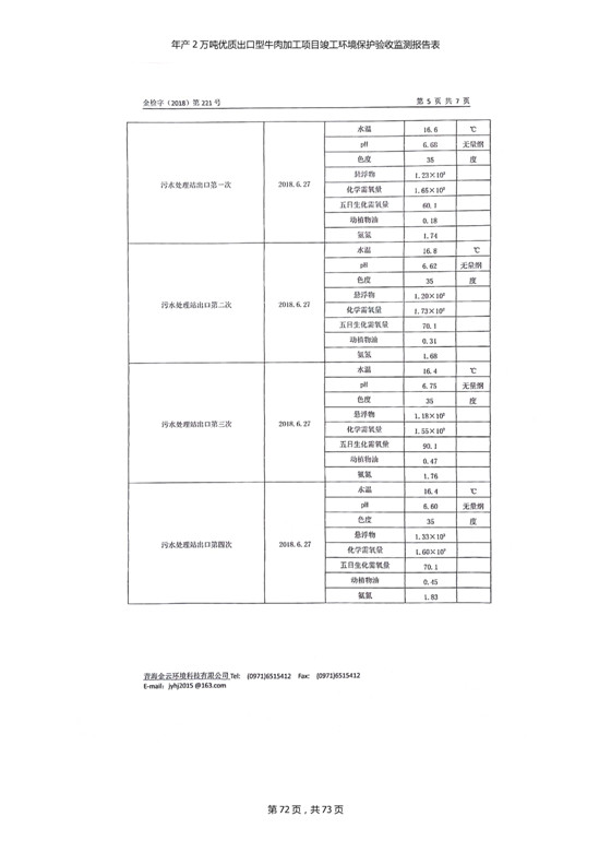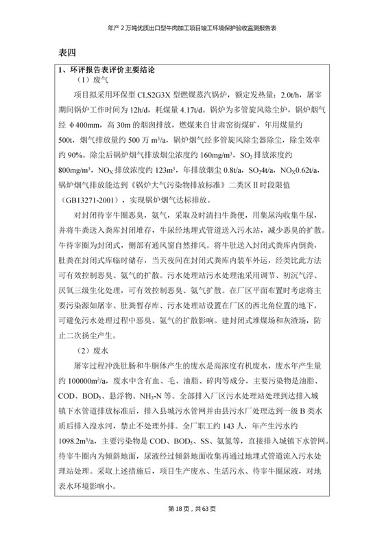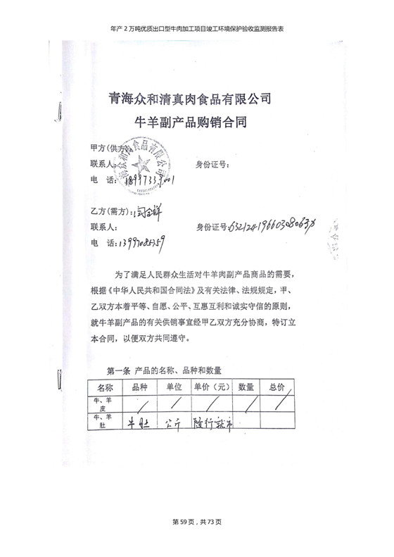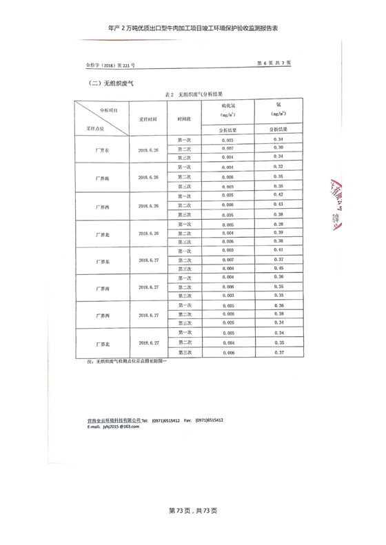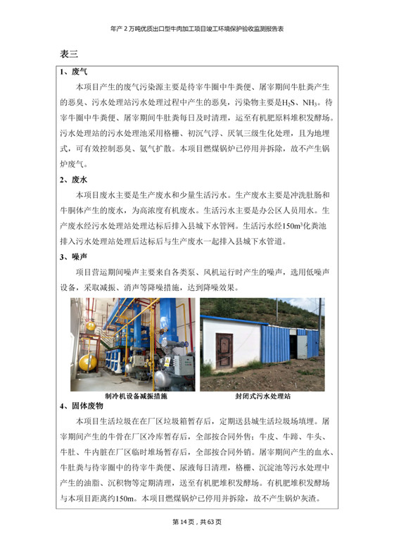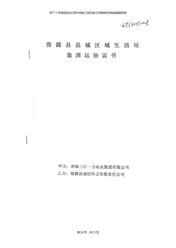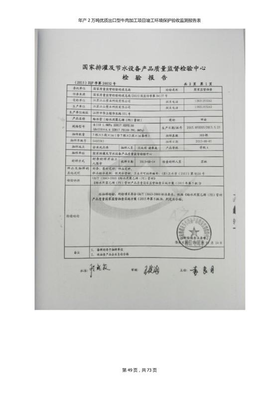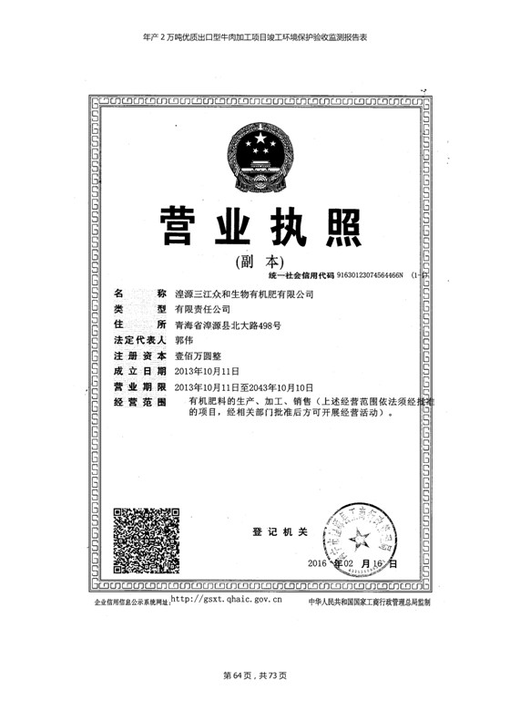 根據(jù)中華人民共和國(guó)國(guó)務(wù)院令第253號(hào)《建設(shè)項(xiàng)目環(huán)境保護(hù)管理?xiàng)l例》(中華人民共和國(guó)國(guó)務(wù)院令第682號(hào)《國(guó)務(wù)院關(guān)于修改〈建設(shè)項(xiàng)目環(huán)境保護(hù)管理?xiàng)l例〉的決定》和《建設(shè)項(xiàng)目竣工環(huán)境保護(hù)驗(yàn)收暫行辦法》,嚴(yán)格依照有關(guān)法律法規(guī),建設(shè)項(xiàng)目環(huán)境保護(hù)設(shè)施驗(yàn)收技術(shù)規(guī)范,本項(xiàng)目環(huán)評(píng)報(bào)告表和環(huán)保審批部門審批意見以及企業(yè)自行驗(yàn)收相關(guān)要求等對(duì)本項(xiàng)目進(jìn)行驗(yàn)收,本項(xiàng)目符合環(huán)保驗(yàn)收條件,可以通過環(huán)保驗(yàn)收。 青海三江一力農(nóng)業(yè)有限公司組織召開年產(chǎn)2萬(wàn)噸優(yōu)質(zhì)出口型牛肉加工項(xiàng)目(一期工程)驗(yàn)收組意見.