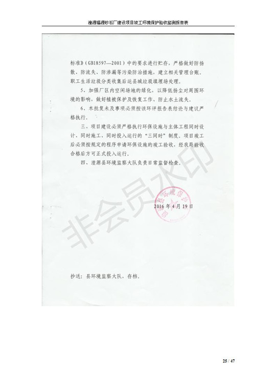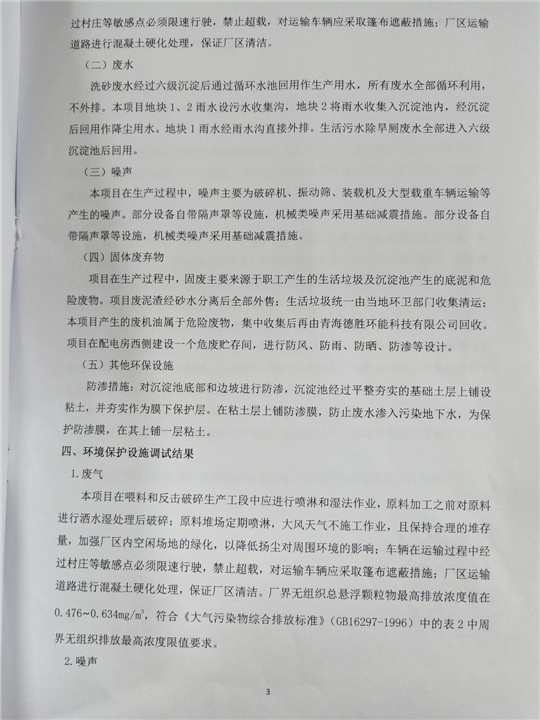 根據(jù)中華人民共和國國務(wù)院令第253號《建設(shè)項目環(huán)境保護管理條例》(中華人民共和國國務(wù)院令第682號《國務(wù)院關(guān)于修改〈建設(shè)項目環(huán)境保護管理條例〉的決定》和《建設(shè)項目竣工環(huán)境保護驗收暫行辦法》,嚴格依照有關(guān)法律法規(guī),建設(shè)項目環(huán)境保護設(shè)施驗收技術(shù)規(guī)范,本項目環(huán)評報告表和環(huán)保審批部門審批意見以及企業(yè)自行驗收相關(guān)要求等對本項目進行驗收,本項目符合環(huán)保驗收條件,可以通過環(huán)保驗收。 湟源福砂廠建設(shè)項目竣工環(huán)境保護驗收意見