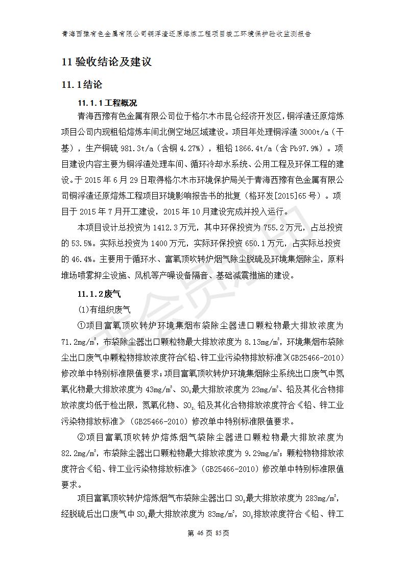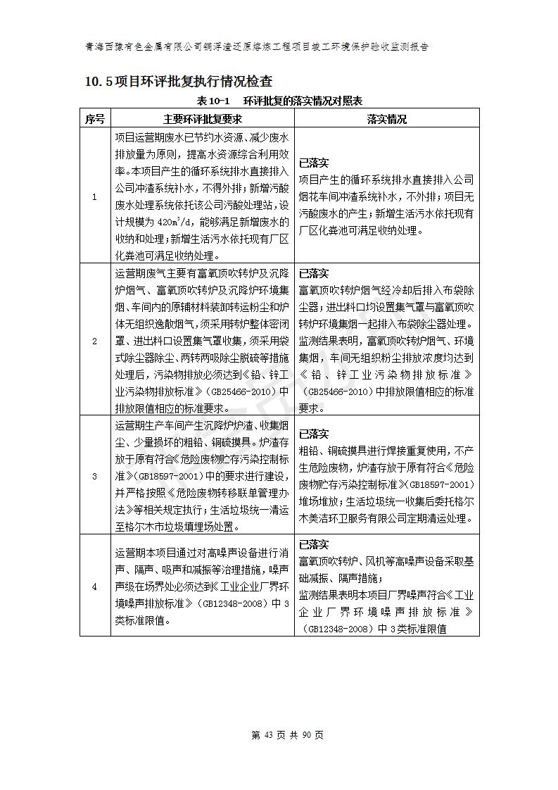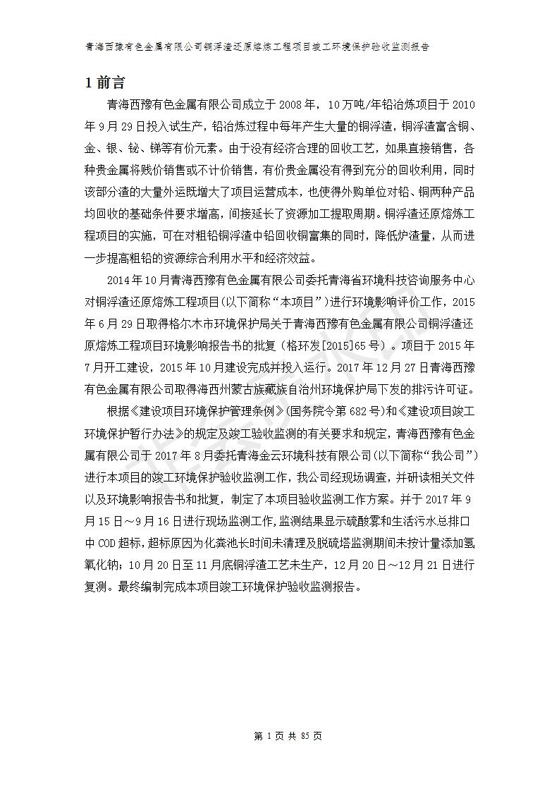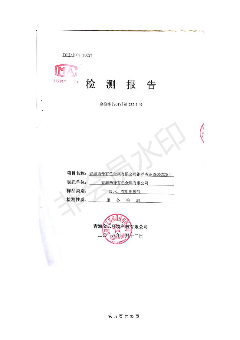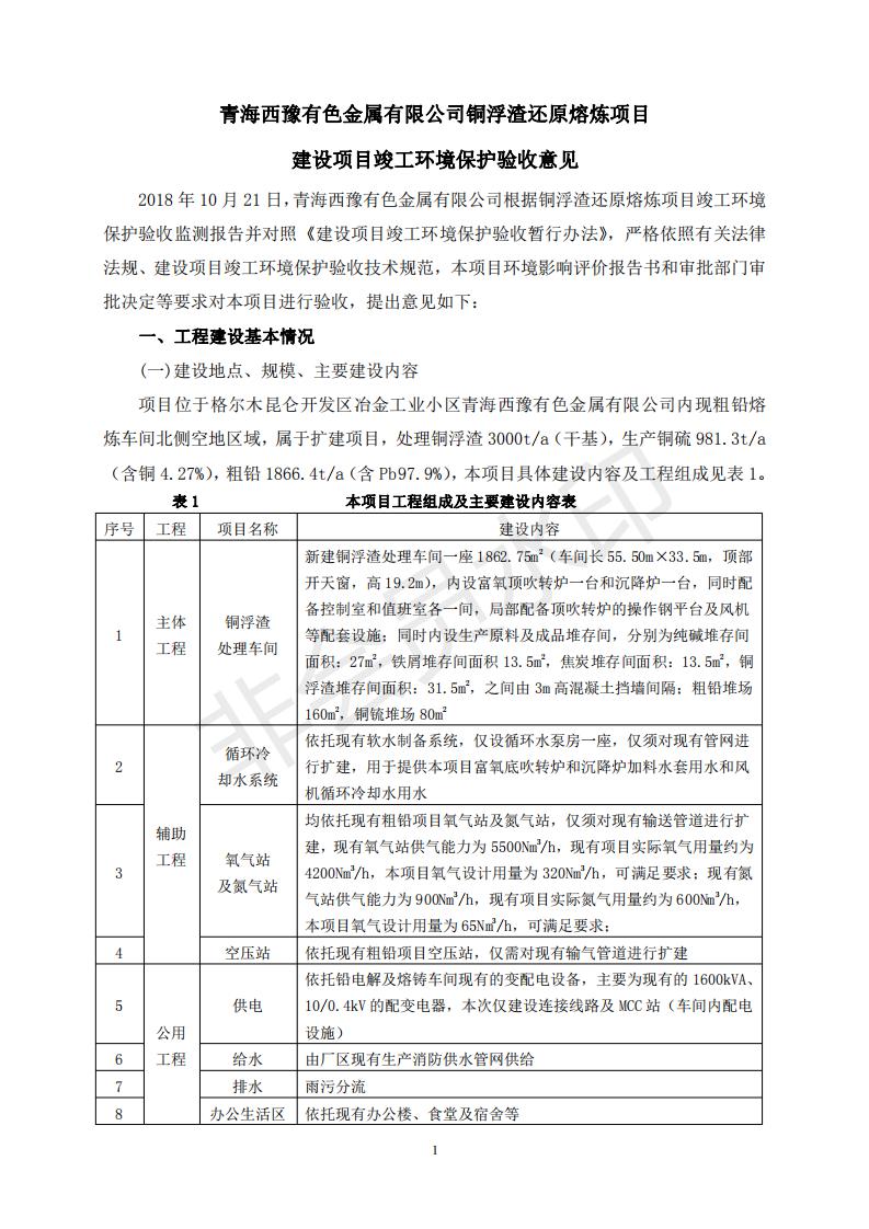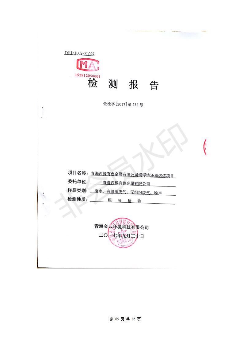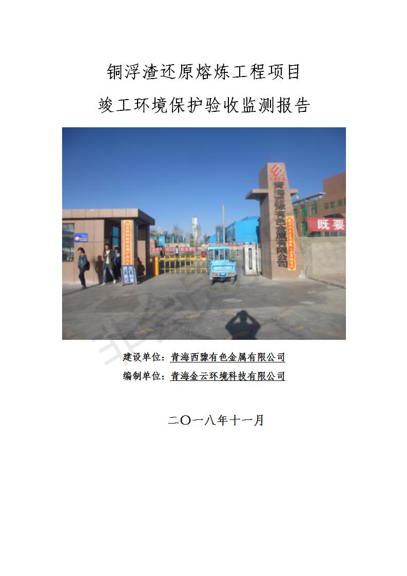 青海西豫有色金屬有限公司銅浮渣還原熔煉工程項(xiàng)目竣工環(huán)境保護(hù)驗(yàn)收監(jiān)測(cè)報(bào)告公示發(fā)布日期:(2018-11-23) 點(diǎn)擊次數(shù):2564 |