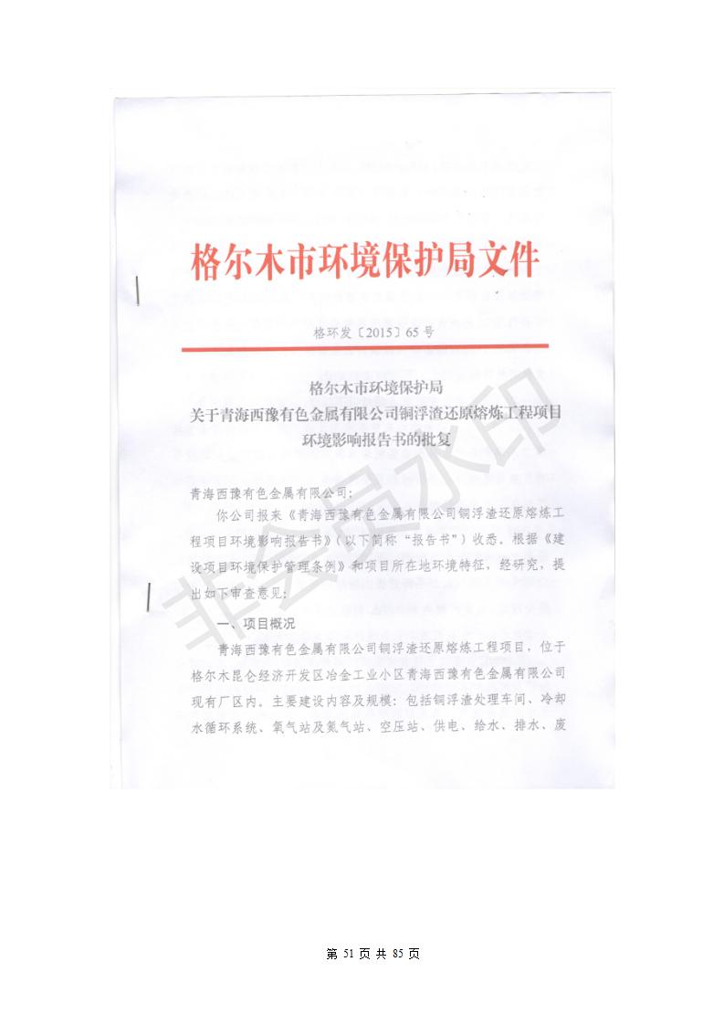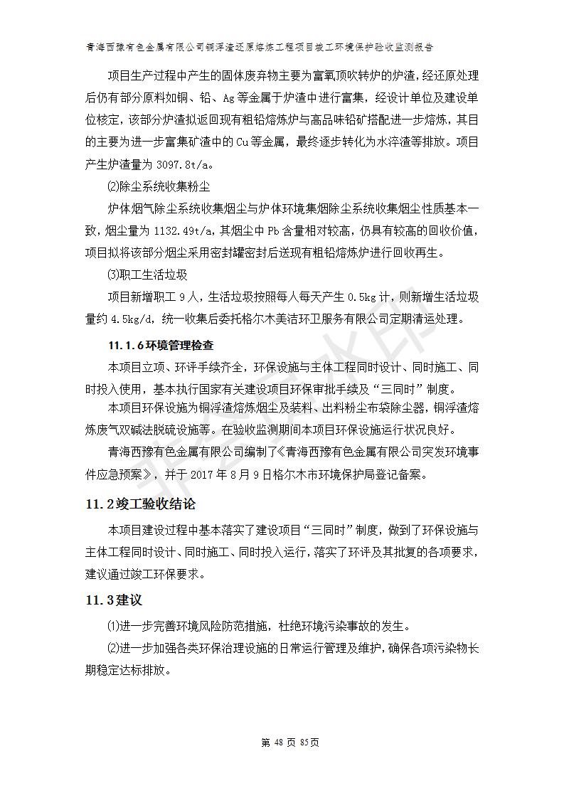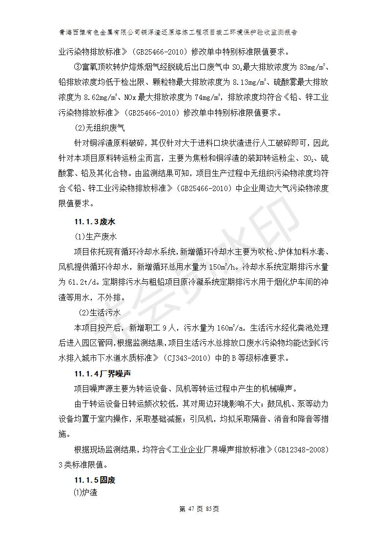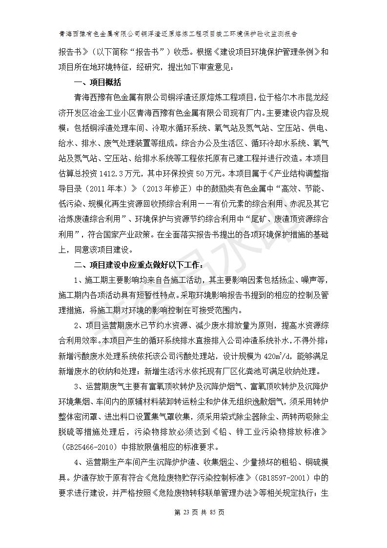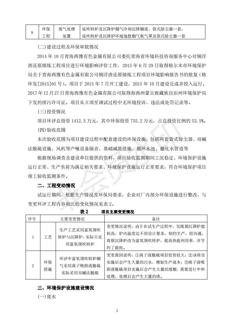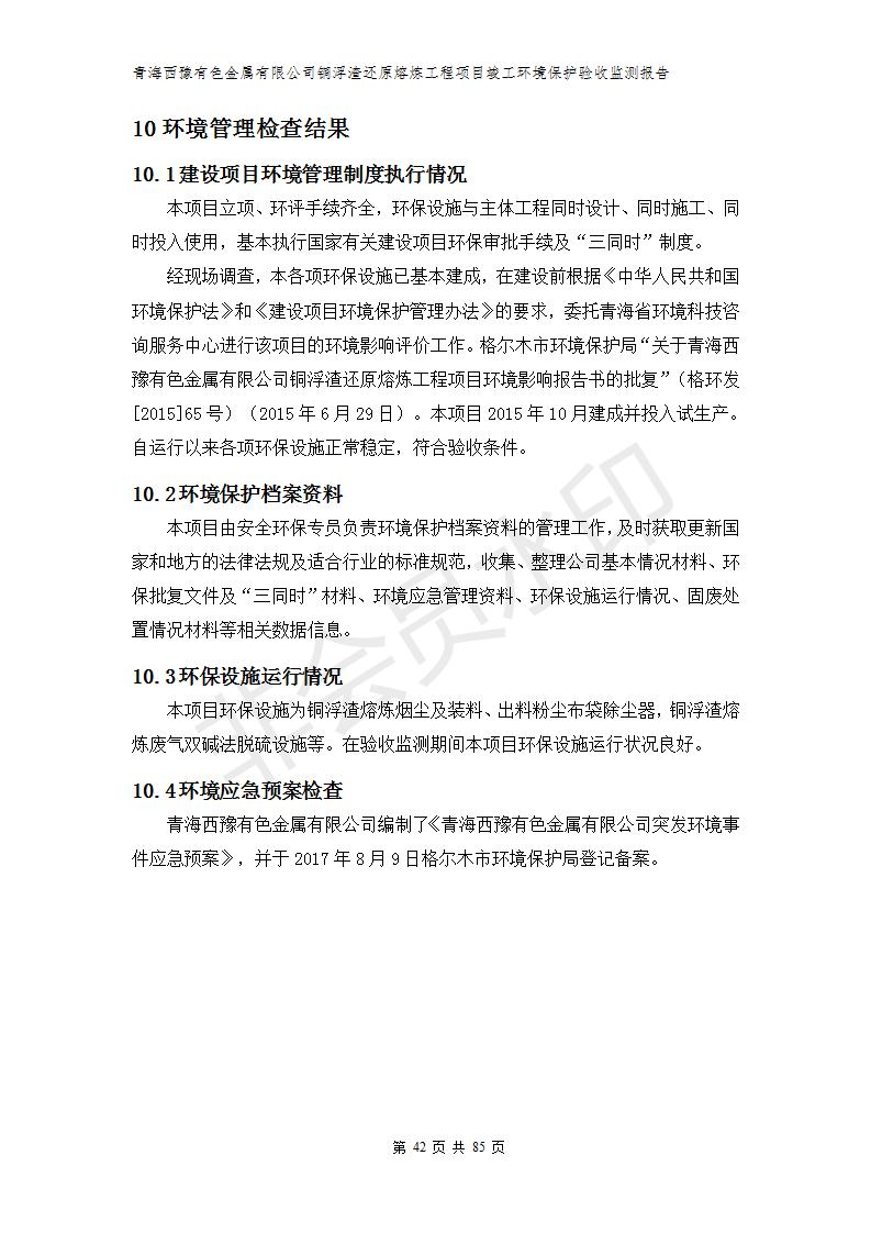 青海西豫有色金屬有限公司銅浮渣還原熔煉工程項(xiàng)目竣工環(huán)境保護(hù)驗(yàn)收監(jiān)測(cè)報(bào)告公示發(fā)布日期:(2018-11-23) 點(diǎn)擊次數(shù):2564 |
