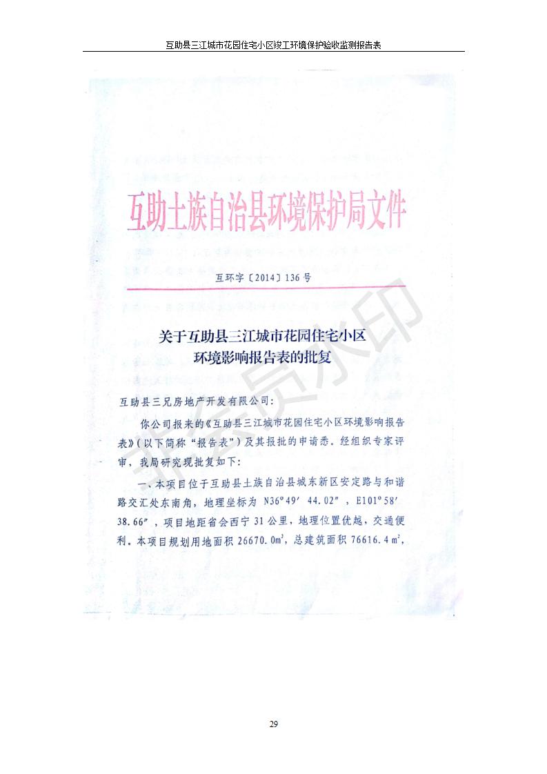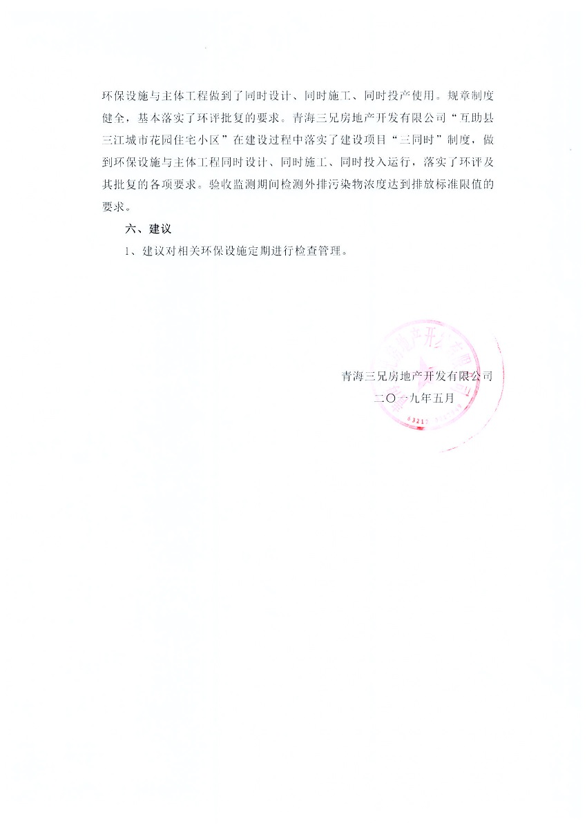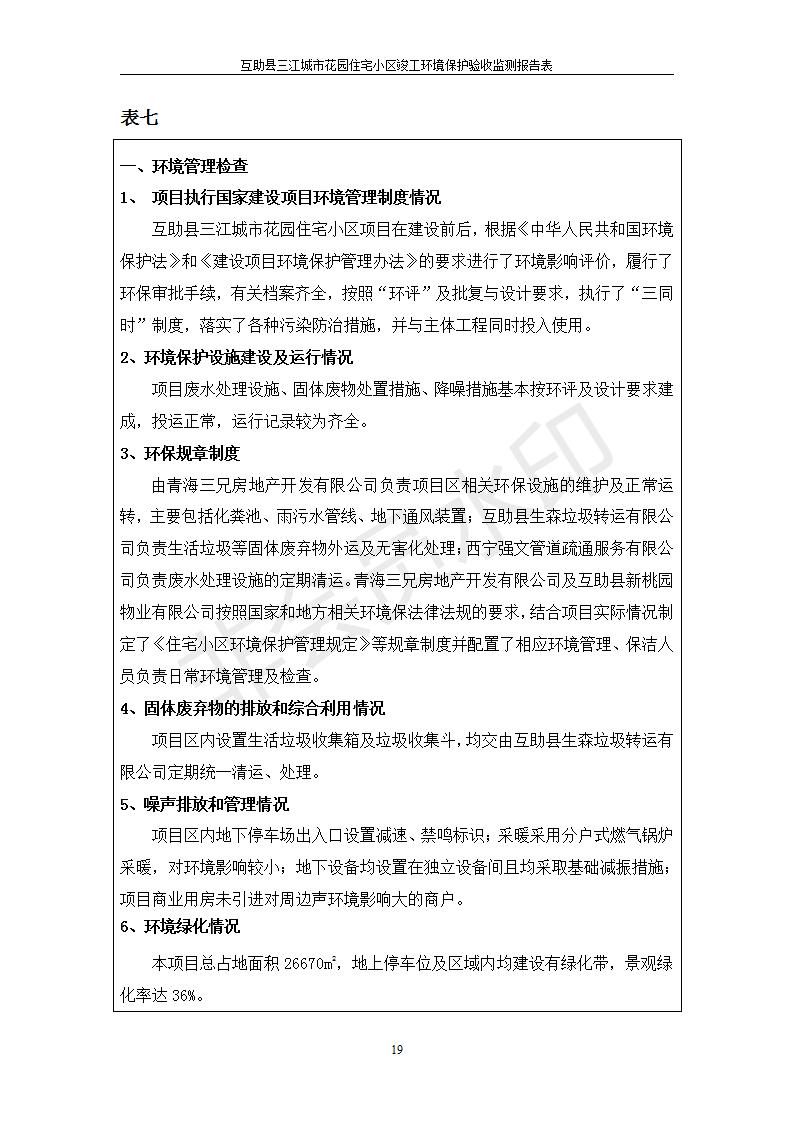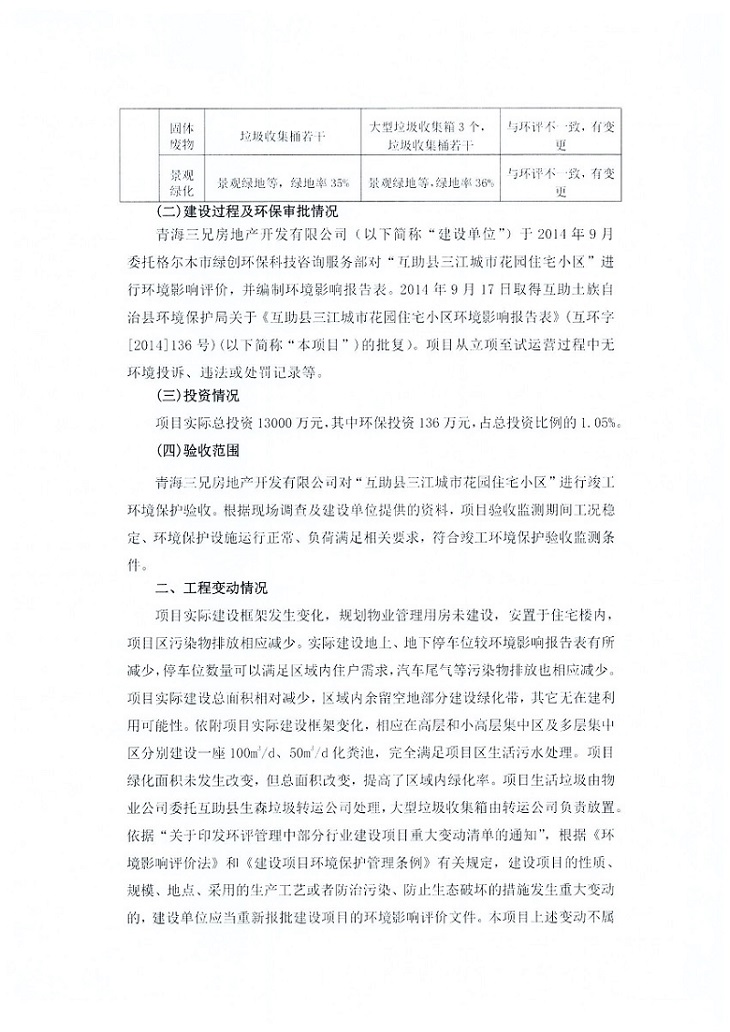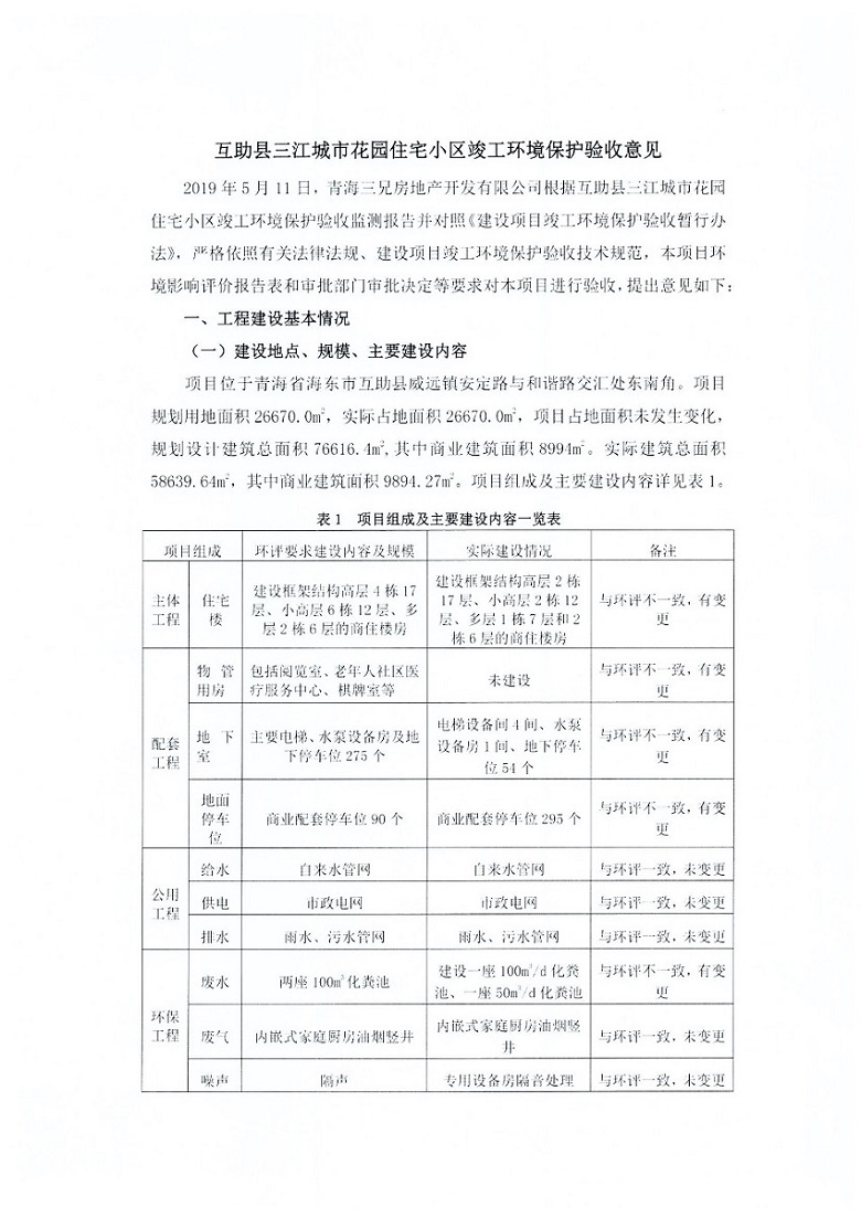 根據(jù)中華人民共和國國務(wù)院令第682號《國務(wù)院關(guān)于修改〈建設(shè)項目環(huán)境保護管理條例〉的決定》和《建設(shè)項目竣工環(huán)境保護驗收暫行辦法》(國務(wù)院令682號),互助縣三江城市花園住宅小區(qū)(包括竣工環(huán)境保護驗收監(jiān)測報告表和驗收意見)公示如下。 一、項目名稱: 互助縣三江城市花園住宅小區(qū)竣工環(huán)境保護驗收監(jiān)測報告表 二、地點:青海省海東市互助土族自治縣威遠(yuǎn)鎮(zhèn)安定路與和諧路交匯處東南角 三、建設(shè)單位:青海三兄房地產(chǎn)開發(fā)有限公司 四、建設(shè)內(nèi)容:項目規(guī)劃用地面積26670.0m2,實際占地面積26670.0m2,項目占地面積未發(fā)生變化,規(guī)劃設(shè)計建筑總面積76616.4m2,其中商業(yè)建筑面積8994m2。實際建筑總面積58639.64m2,其中商業(yè)建筑面積9894.27m2。 五、聯(lián)系人:張工 六、聯(lián)系電 話:0971-6515411 七、公示時間:二〇一九年六月五日至二〇一九年七月三日 公示期間,對上述公示內(nèi)容如有異議,請以書面形式反饋,個人須署真實姓名,單位須加蓋公章。