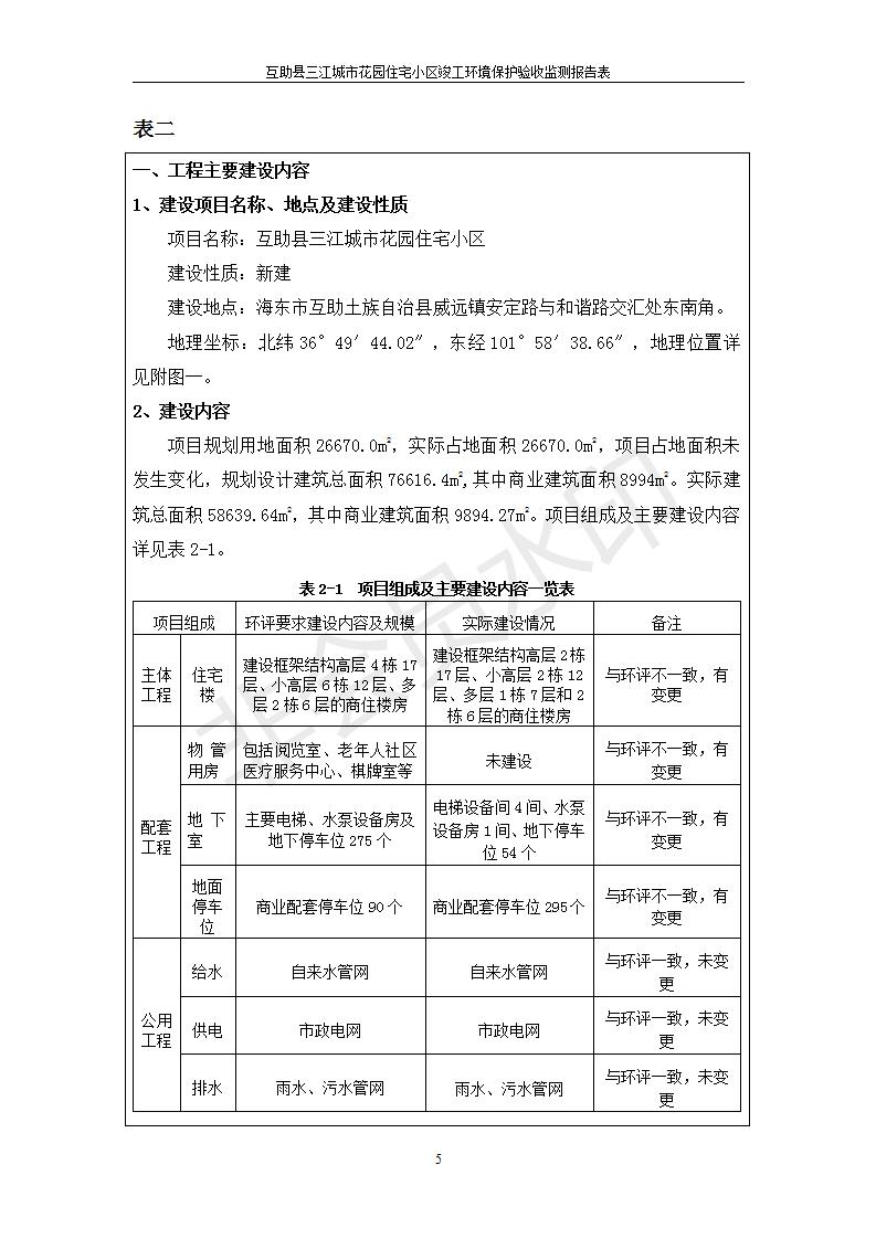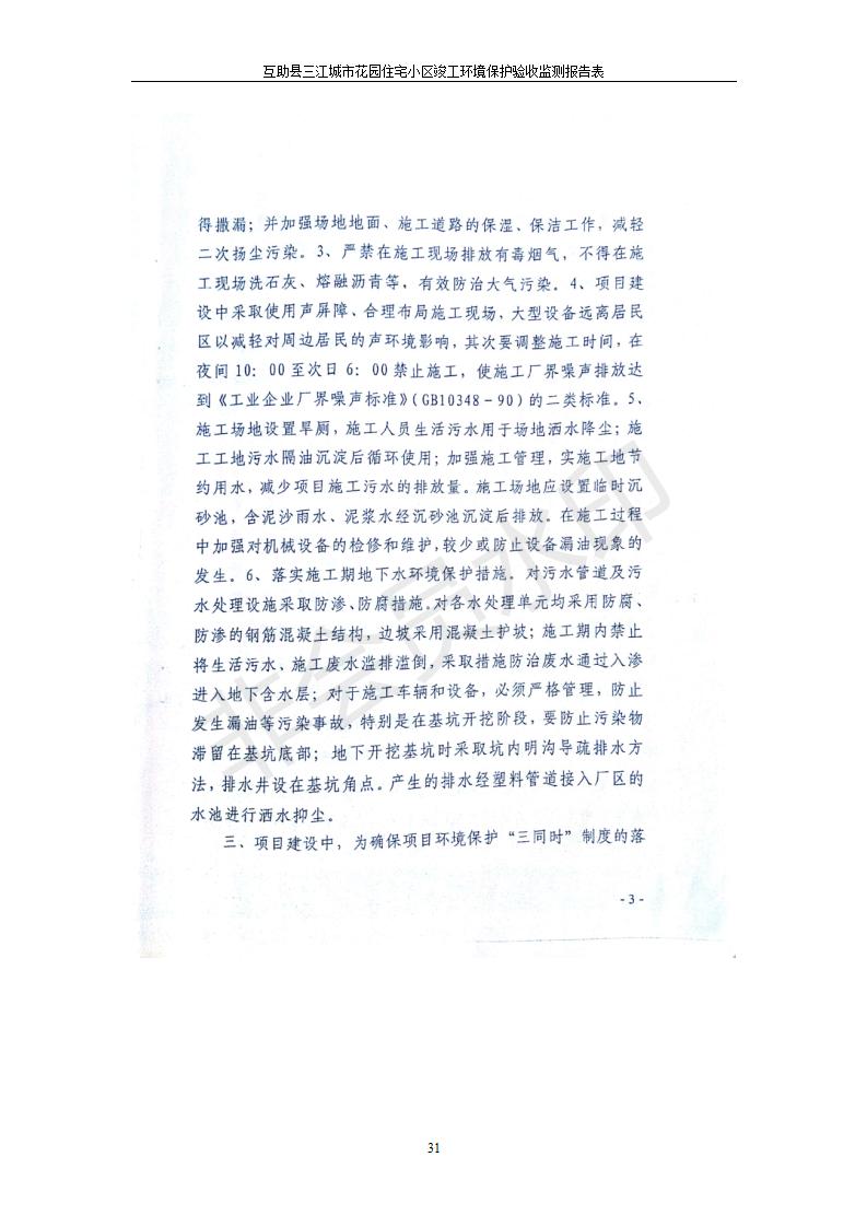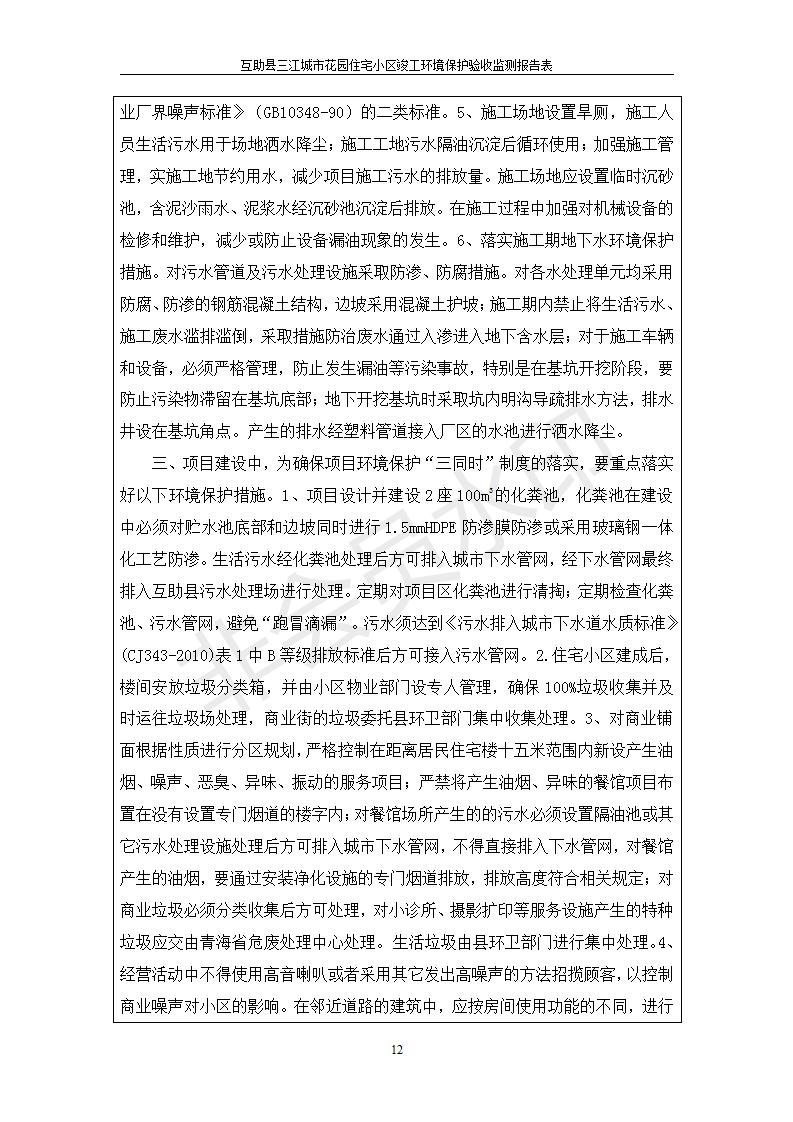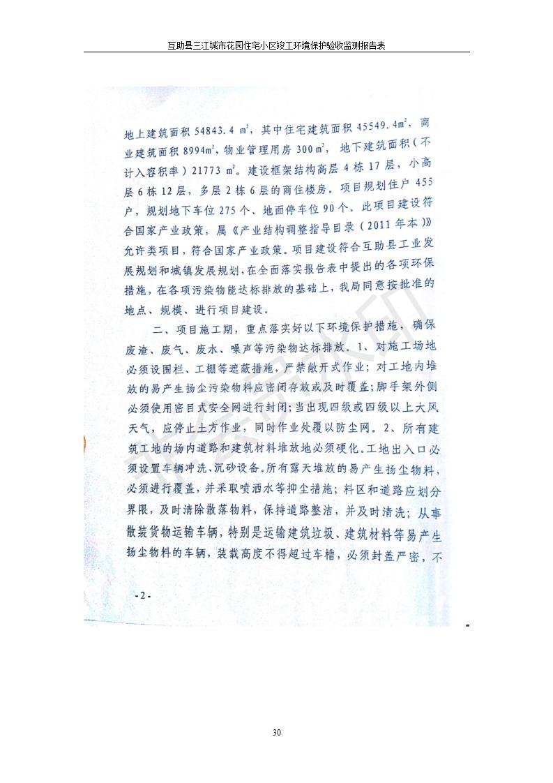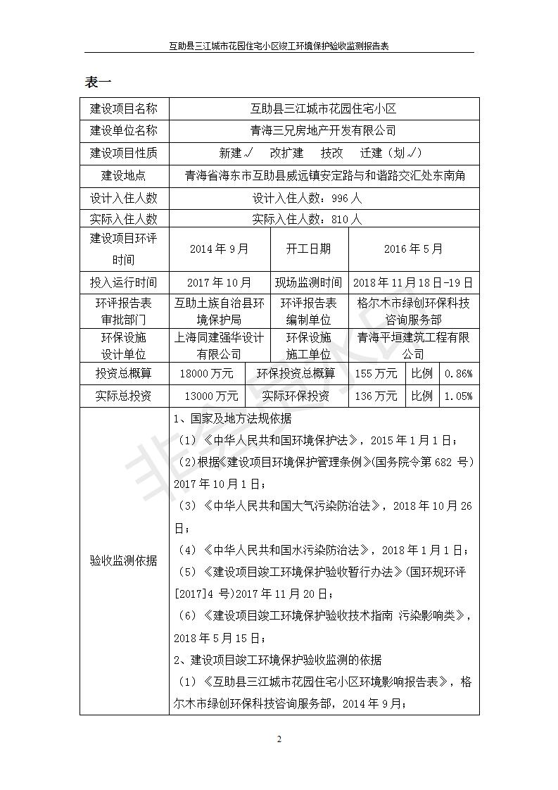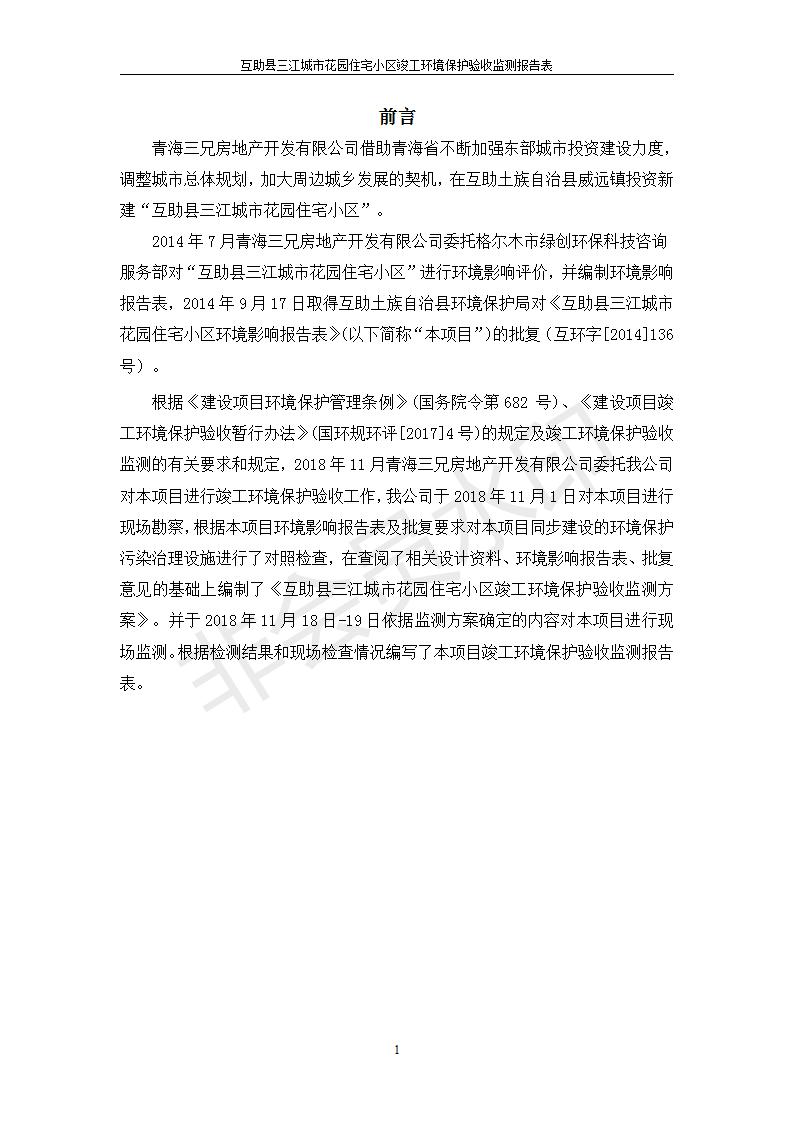 根據(jù)中華人民共和國國務(wù)院令第682號《國務(wù)院關(guān)于修改〈建設(shè)項目環(huán)境保護管理條例〉的決定》和《建設(shè)項目竣工環(huán)境保護驗收暫行辦法》(國務(wù)院令682號),互助縣三江城市花園住宅小區(qū)(包括竣工環(huán)境保護驗收監(jiān)測報告表和驗收意見)公示如下。 一、項目名稱: 互助縣三江城市花園住宅小區(qū)竣工環(huán)境保護驗收監(jiān)測報告表 二、地點:青海省海東市互助土族自治縣威遠(yuǎn)鎮(zhèn)安定路與和諧路交匯處東南角 三、建設(shè)單位:青海三兄房地產(chǎn)開發(fā)有限公司 四、建設(shè)內(nèi)容:項目規(guī)劃用地面積26670.0m2,實際占地面積26670.0m2,項目占地面積未發(fā)生變化,規(guī)劃設(shè)計建筑總面積76616.4m2,其中商業(yè)建筑面積8994m2。實際建筑總面積58639.64m2,其中商業(yè)建筑面積9894.27m2。 五、聯(lián)系人:張工 六、聯(lián)系電 話:0971-6515411 七、公示時間:二〇一九年六月五日至二〇一九年七月三日 公示期間,對上述公示內(nèi)容如有異議,請以書面形式反饋,個人須署真實姓名,單位須加蓋公章。