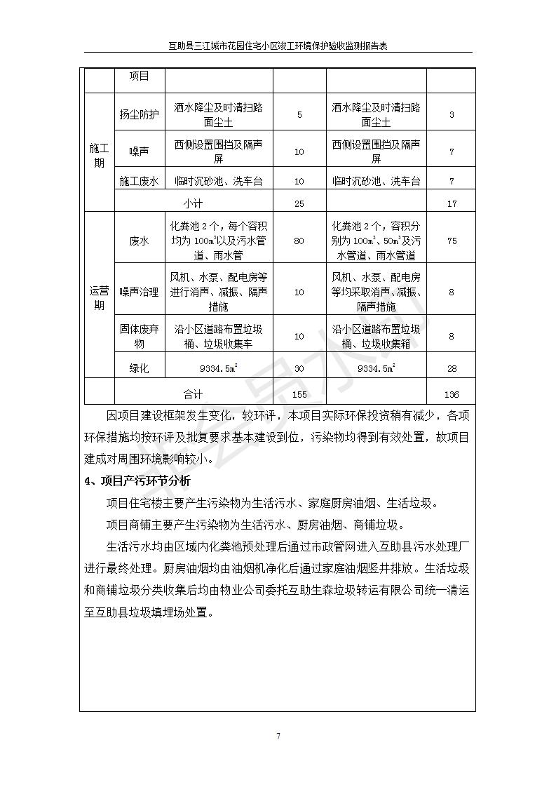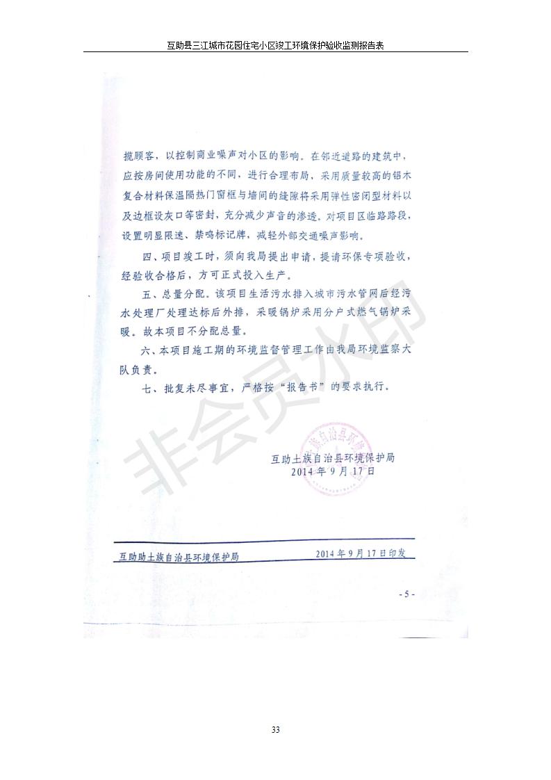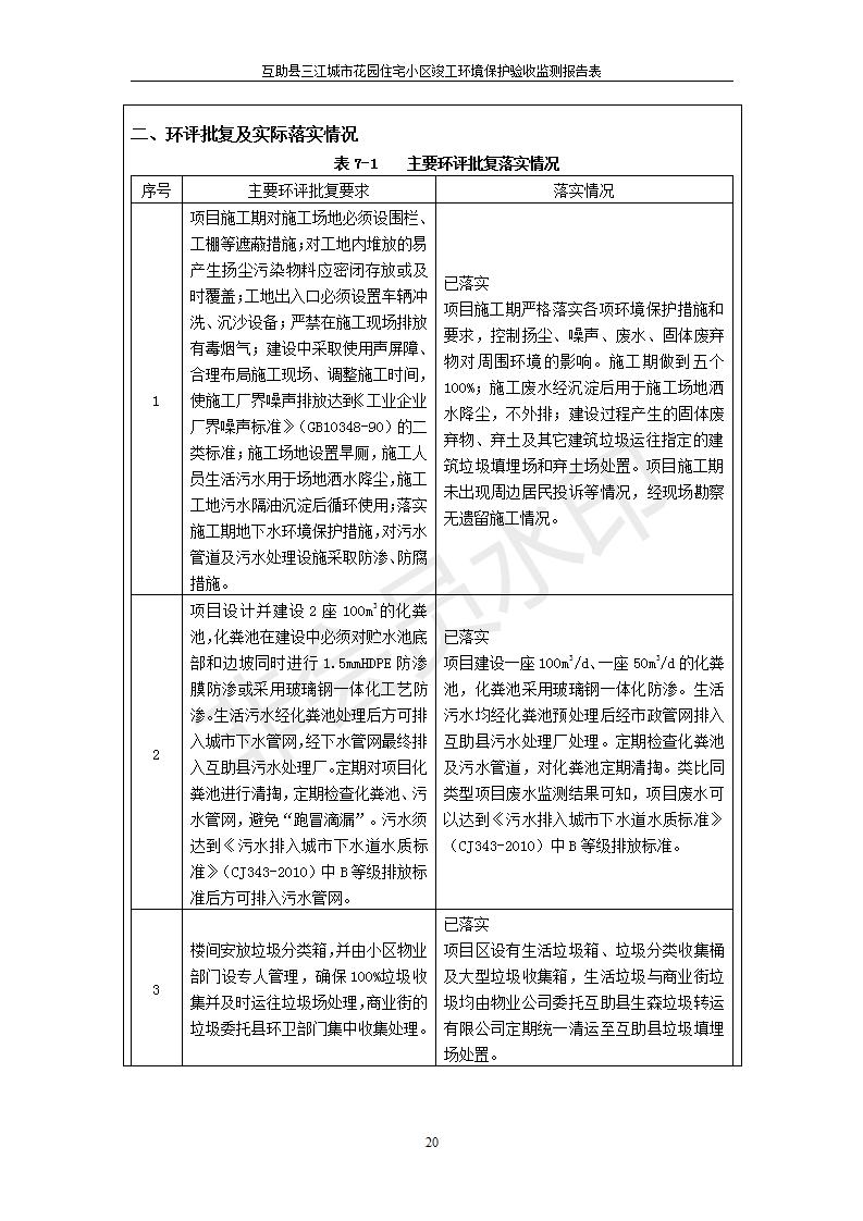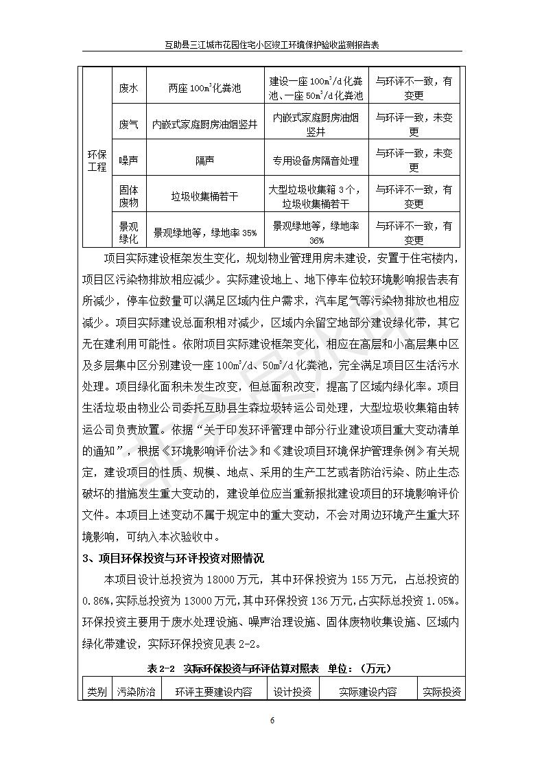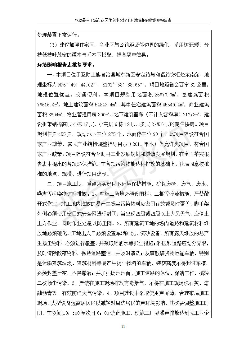 根據(jù)中華人民共和國國務(wù)院令第682號《國務(wù)院關(guān)于修改〈建設(shè)項目環(huán)境保護管理條例〉的決定》和《建設(shè)項目竣工環(huán)境保護驗收暫行辦法》(國務(wù)院令682號),互助縣三江城市花園住宅小區(qū)(包括竣工環(huán)境保護驗收監(jiān)測報告表和驗收意見)公示如下。 一、項目名稱: 互助縣三江城市花園住宅小區(qū)竣工環(huán)境保護驗收監(jiān)測報告表 二、地點:青海省海東市互助土族自治縣威遠(yuǎn)鎮(zhèn)安定路與和諧路交匯處東南角 三、建設(shè)單位:青海三兄房地產(chǎn)開發(fā)有限公司 四、建設(shè)內(nèi)容:項目規(guī)劃用地面積26670.0m2,實際占地面積26670.0m2,項目占地面積未發(fā)生變化,規(guī)劃設(shè)計建筑總面積76616.4m2,其中商業(yè)建筑面積8994m2。實際建筑總面積58639.64m2,其中商業(yè)建筑面積9894.27m2。 五、聯(lián)系人:張工 六、聯(lián)系電 話:0971-6515411 七、公示時間:二〇一九年六月五日至二〇一九年七月三日 公示期間,對上述公示內(nèi)容如有異議,請以書面形式反饋,個人須署真實姓名,單位須加蓋公章。