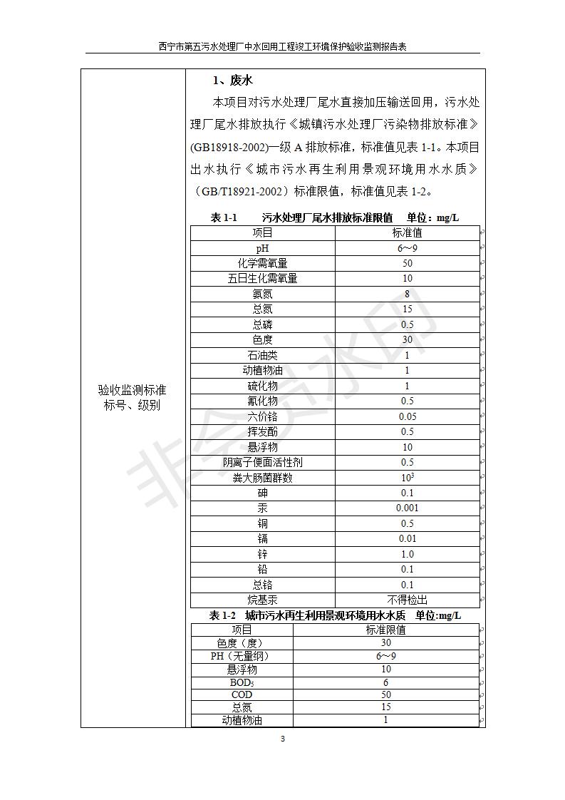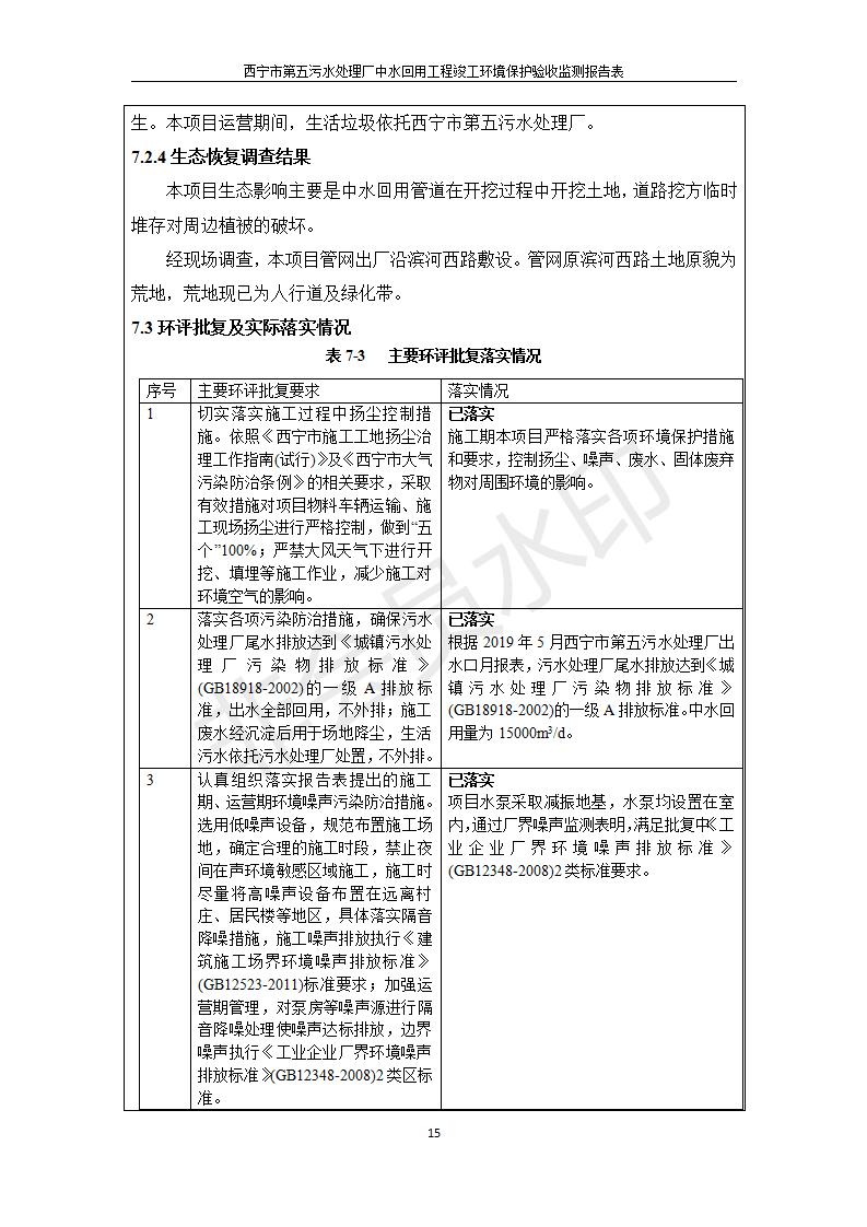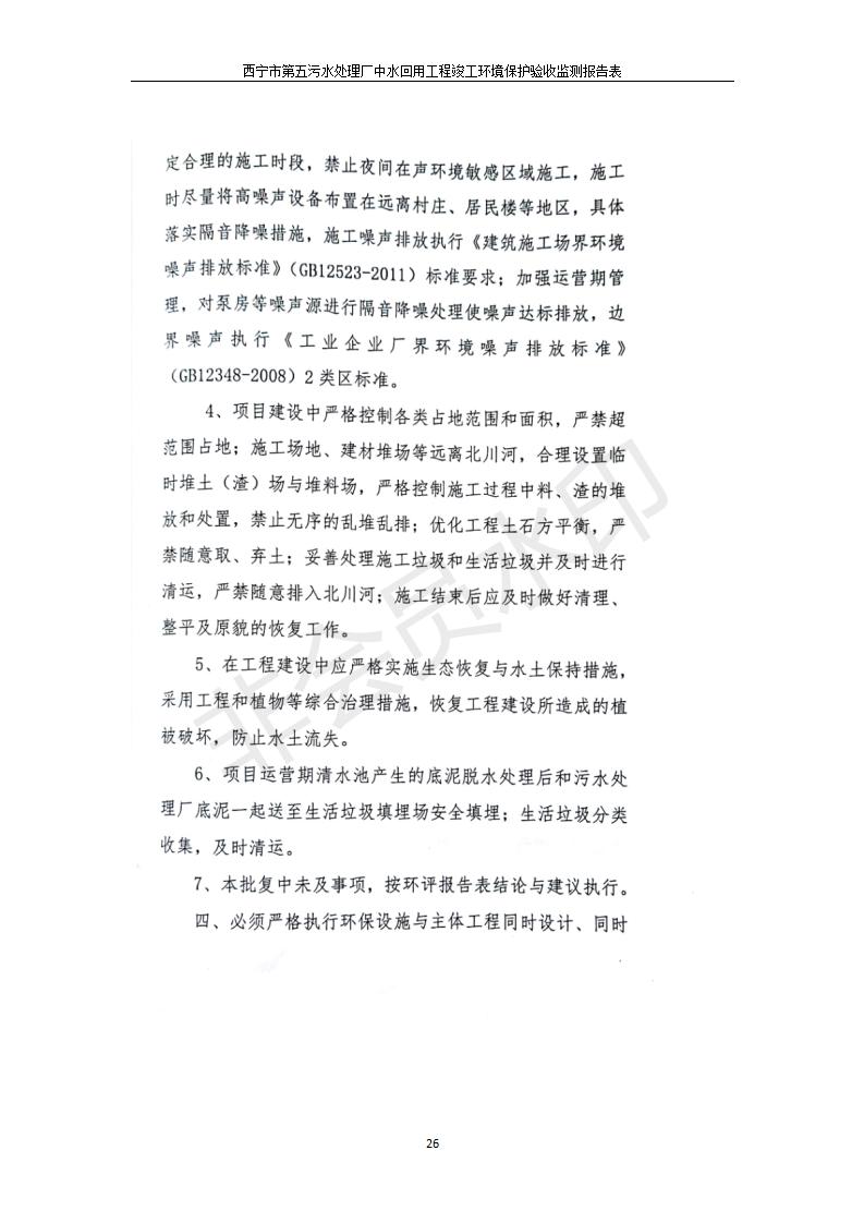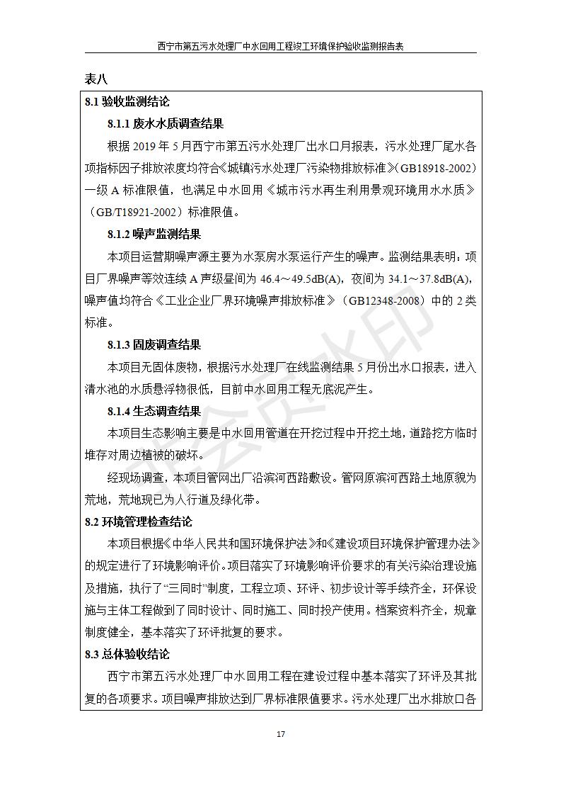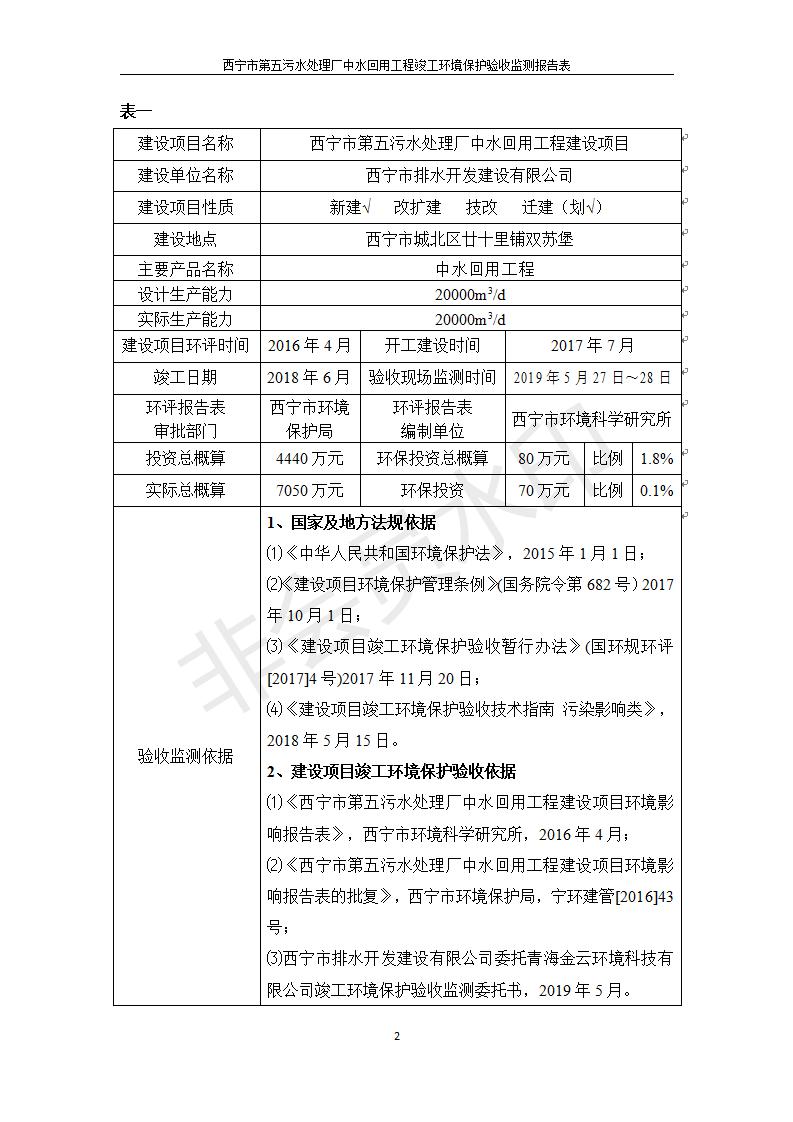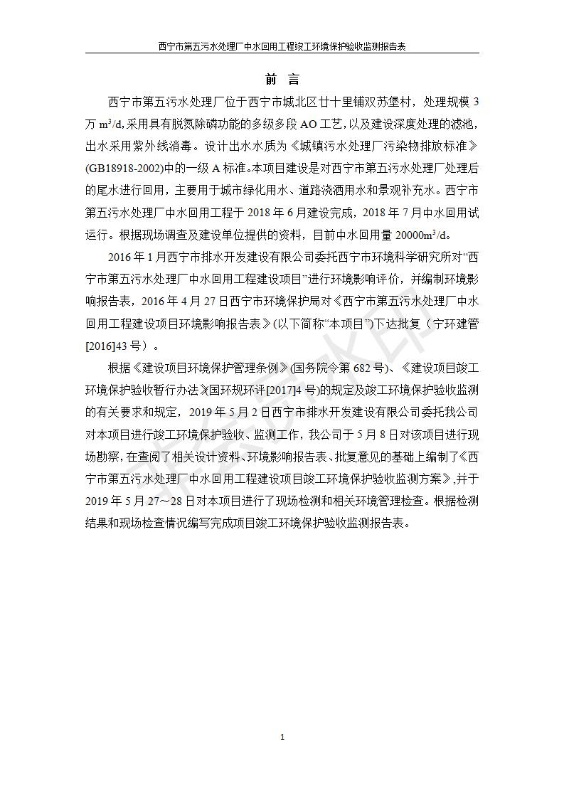 根據中華人民共和國國務院令第682號《國務院關于修改〈建設項目環(huán)境保護管理條例〉的決定》和《建設項目竣工環(huán)境保護驗收暫行辦法》(國務院令682號),西寧市第五污水處理廠中水回用工程建設項目(包括竣工環(huán)境保護驗收監(jiān)測報告表和驗收意見)公示如下。 一、項目名稱:西寧市第五污水處理廠中水回用工程建設項目 二、地點:西寧市城北區(qū)廿十里鋪雙蘇堡 三、建設單位:西寧市排水開發(fā)建設有限公司