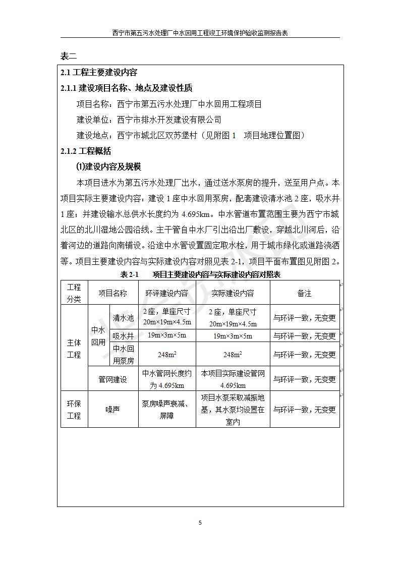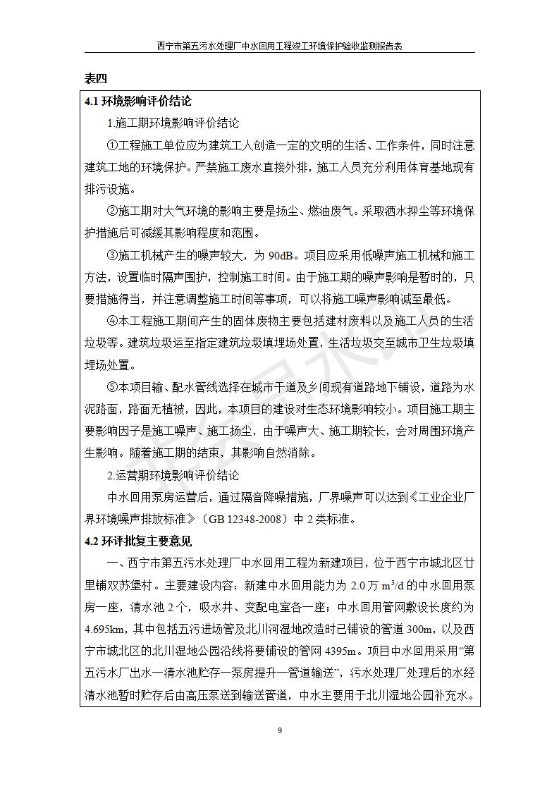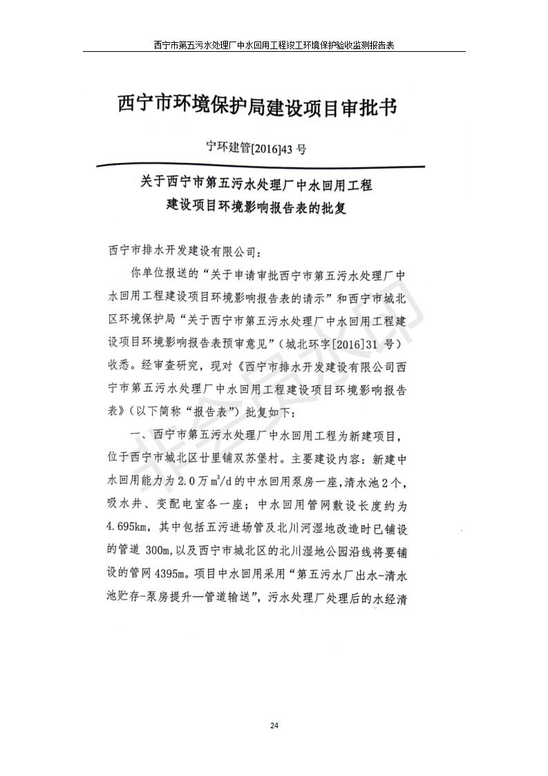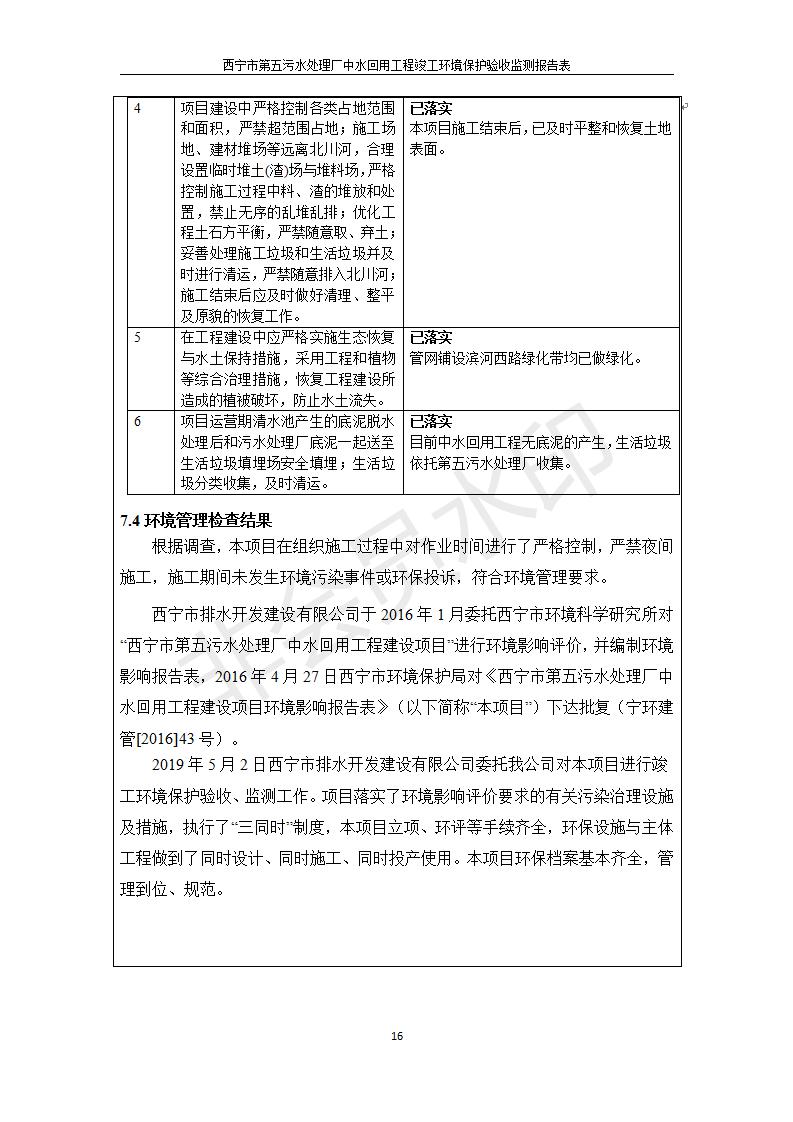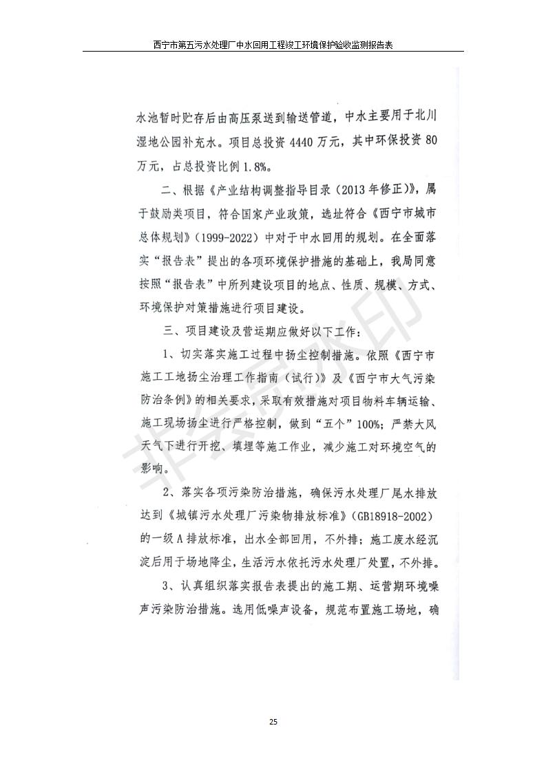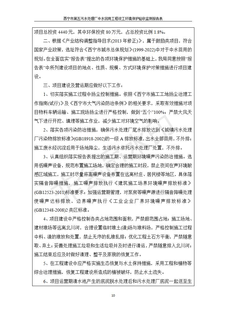 根據中華人民共和國國務院令第682號《國務院關于修改〈建設項目環(huán)境保護管理條例〉的決定》和《建設項目竣工環(huán)境保護驗收暫行辦法》(國務院令682號),西寧市第五污水處理廠中水回用工程建設項目(包括竣工環(huán)境保護驗收監(jiān)測報告表和驗收意見)公示如下。 一、項目名稱:西寧市第五污水處理廠中水回用工程建設項目 二、地點:西寧市城北區(qū)廿十里鋪雙蘇堡 三、建設單位:西寧市排水開發(fā)建設有限公司