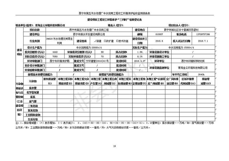 西寧市第五污水處理廠中水回用工程建設項目竣工環(huán)境保護驗收監(jiān)測報告表公示發(fā)布日期:(2019-7-10) 點擊次數:2287 |