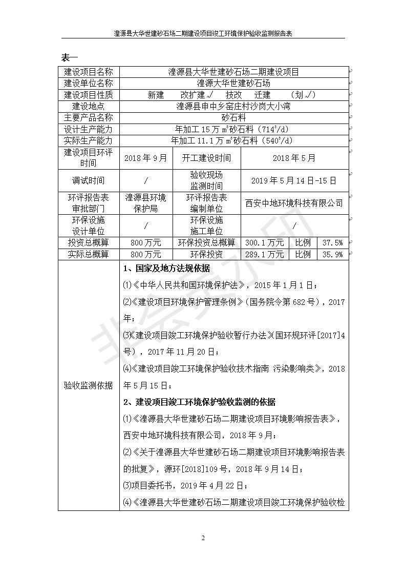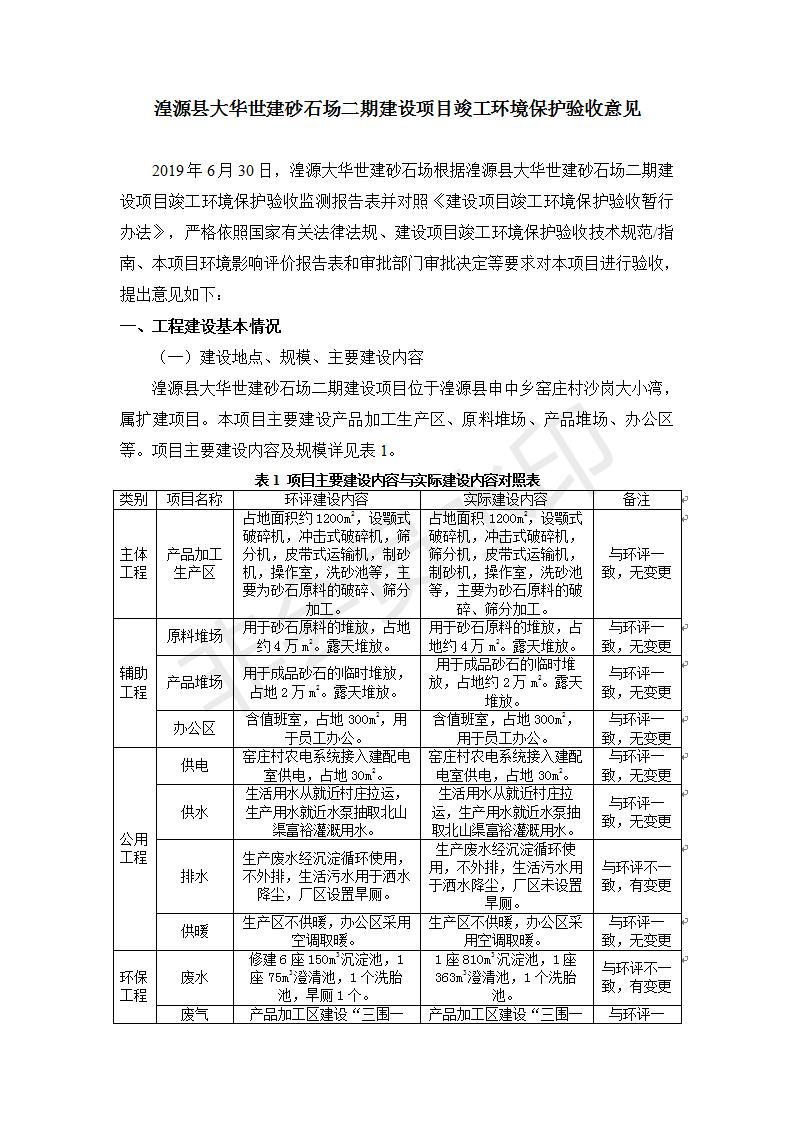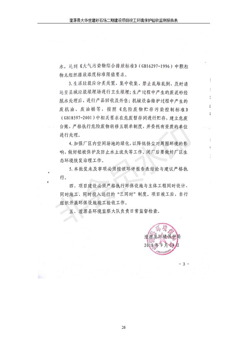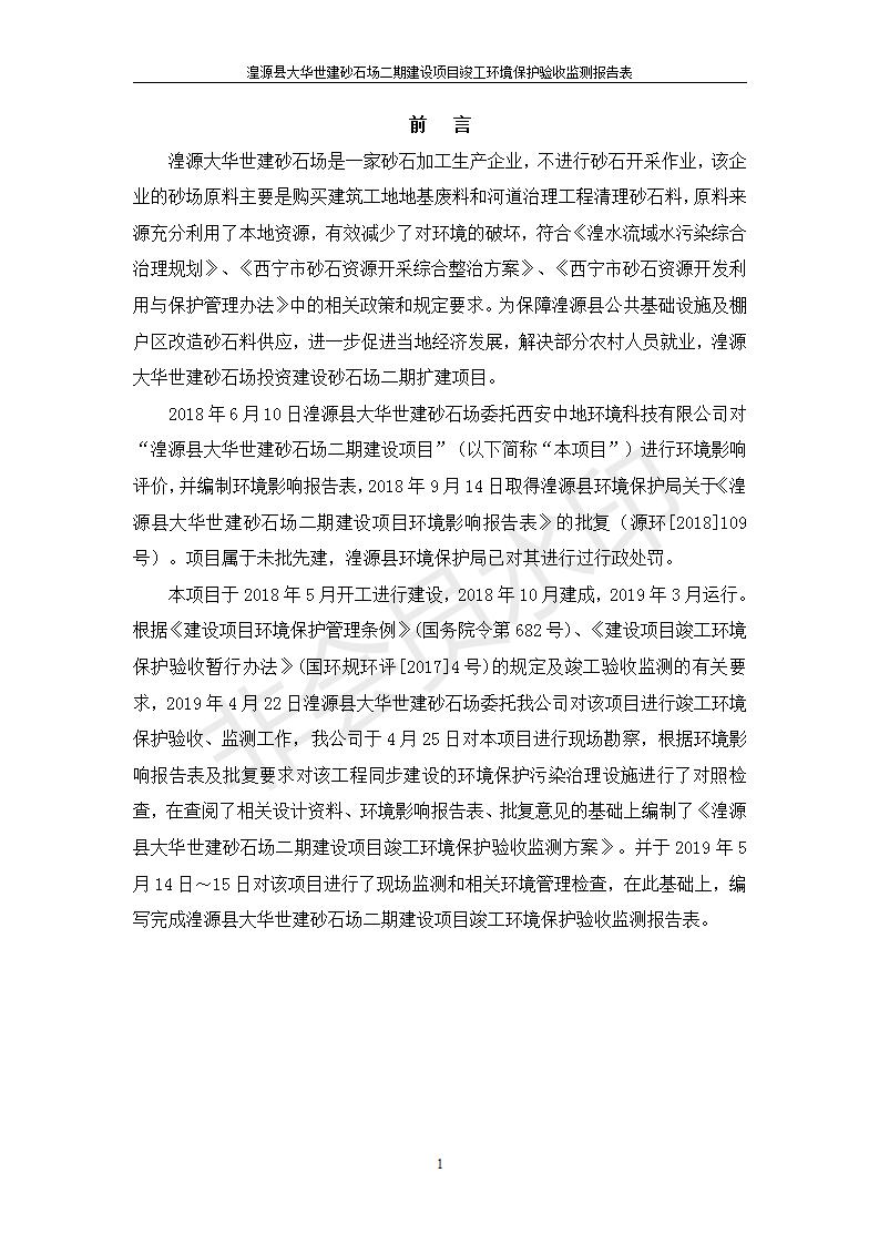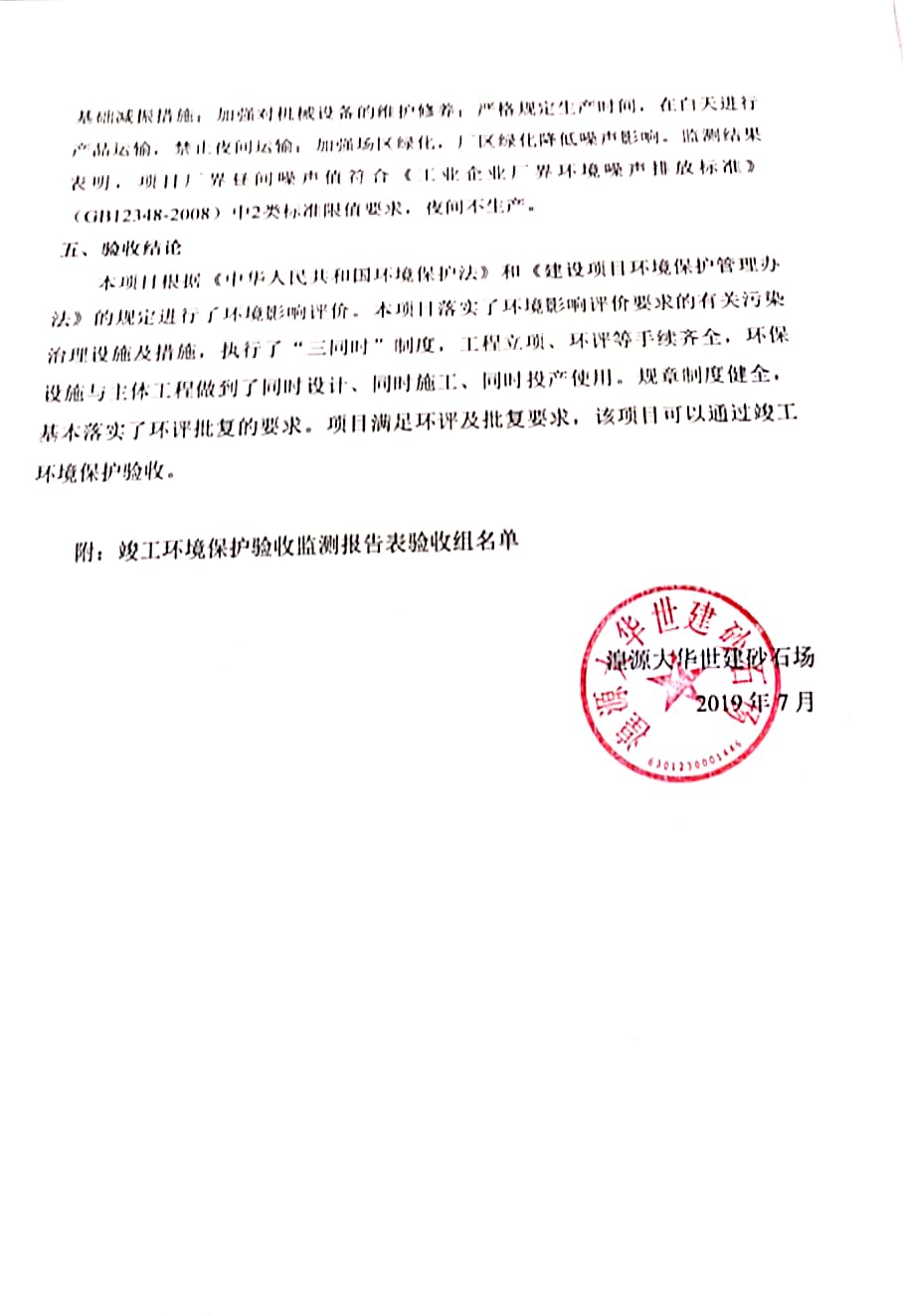 根據(jù)中華人民共和國國務(wù)院令第682號《國務(wù)院關(guān)于修改〈建設(shè)項目環(huán)境保護管理條例〉的決定》和《建設(shè)項目竣工環(huán)境保護驗收暫行辦法》(國務(wù)院令682號),湟源大華世建砂石場湟源縣大華世建砂石場二期建設(shè)項目(包括竣工環(huán)境保護驗收監(jiān)測報告表和驗收意見)公示如下。 一、項目名稱:湟源縣大華世建砂石場二期建設(shè)項目 二、地點:湟源縣申中鄉(xiāng)窯莊村沙崗大小灣 三、建設(shè)單位:湟源大華世建砂石場 四、建設(shè)內(nèi)容:項目主要建設(shè)砂石料產(chǎn)品加工生產(chǎn)區(qū)、原料堆場、產(chǎn)品堆場、辦公區(qū)等。五、聯(lián)系人:張工 六、聯(lián)系電 話:0971-6515411 七、公示時間:二〇一九年七月二十五日至二〇一九年八月二十一日公示期間,對上述公示內(nèi)容如有異議,請以書面形式反饋,個人須署真實姓名,單位須加蓋公章。
