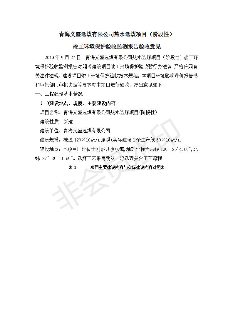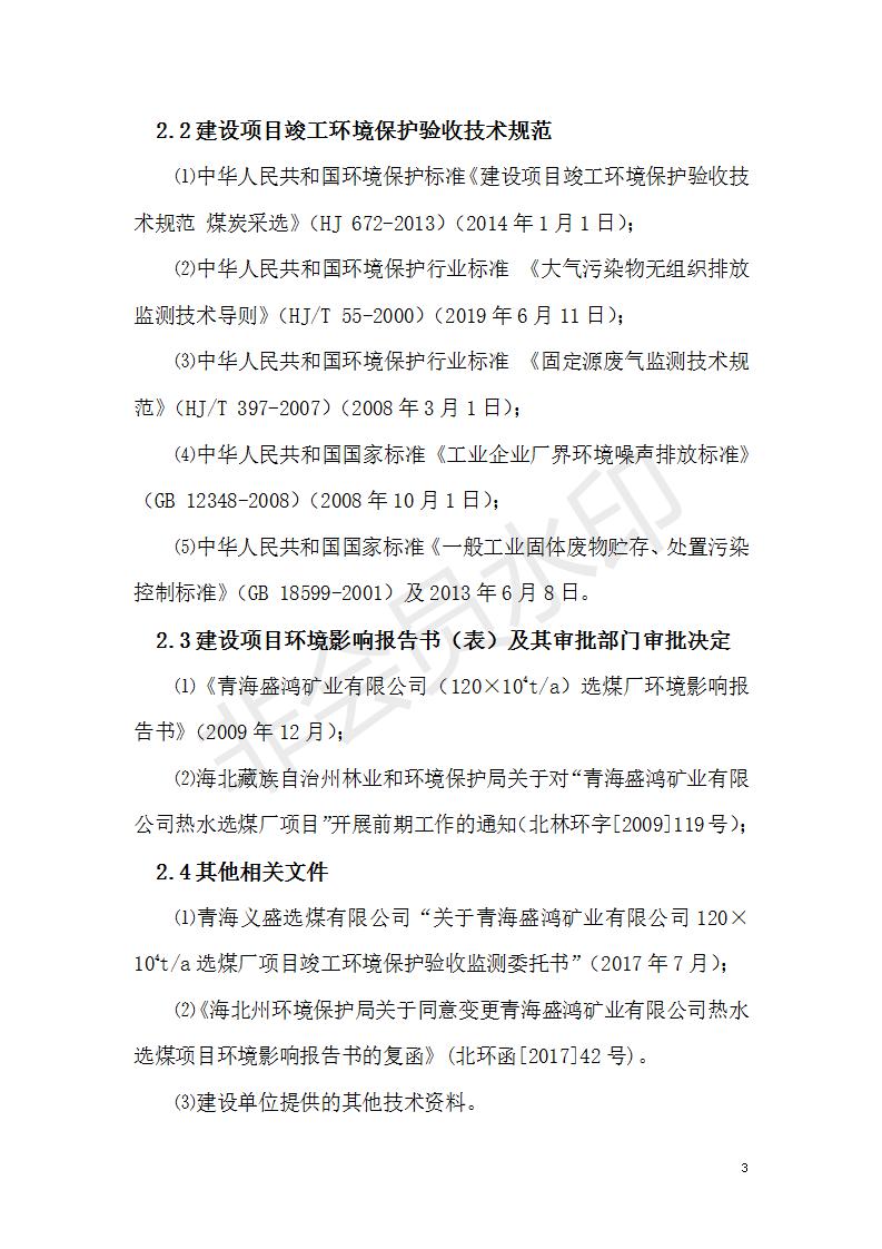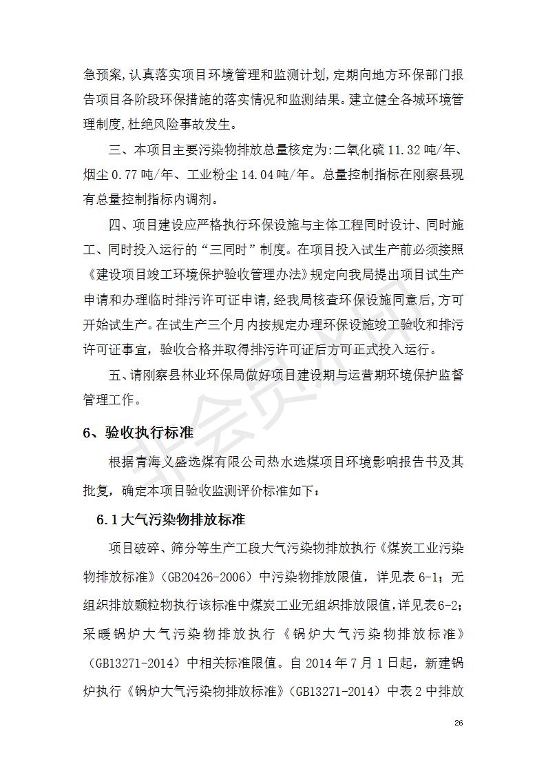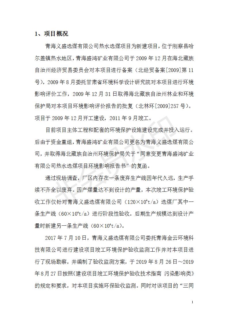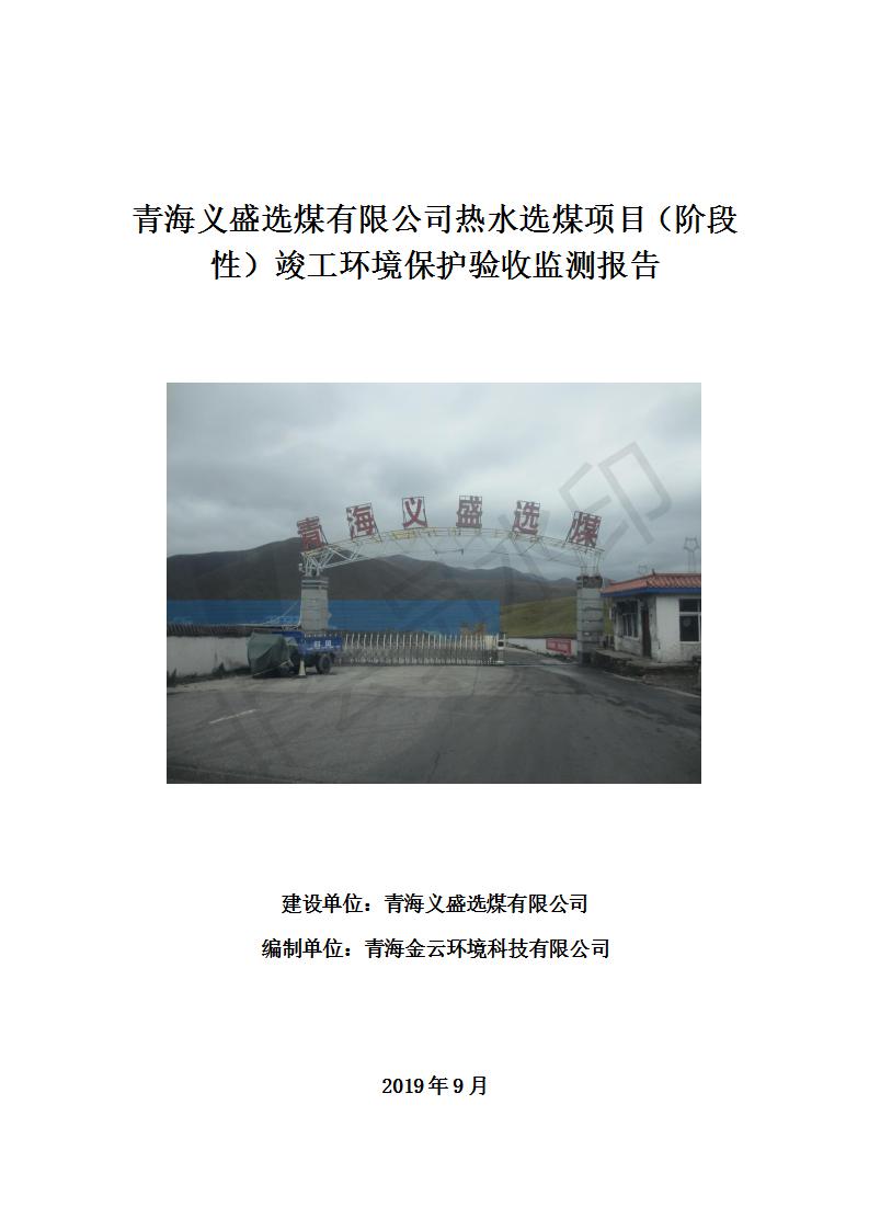 根據(jù)中華人民共和國國務院令第682號《國務院關(guān)于修改〈建設(shè)項目環(huán)境保護管理條例〉的決定》和《建設(shè)項目竣工環(huán)境保護驗收暫行辦法》(國務院令682號),青海義盛選煤有限公司熱水選煤項目(階段性)竣工環(huán)境保護驗收監(jiān)測報告(包括竣工環(huán)境保護驗收監(jiān)測報告和驗收意見)公示如下。 一、項目名稱:青海義盛選煤有限公司熱水選煤項目(階段性) 二、地點:剛察縣熱水鎮(zhèn) 此外還包括公用工程系統(tǒng)、消防系統(tǒng)及輔助生產(chǎn)設(shè)施等。 五、聯(lián)系人:張工六、聯(lián)系電話:0971-6515411 七、公示時間:二〇一九年十一月十二日至二〇一九年十二月九日