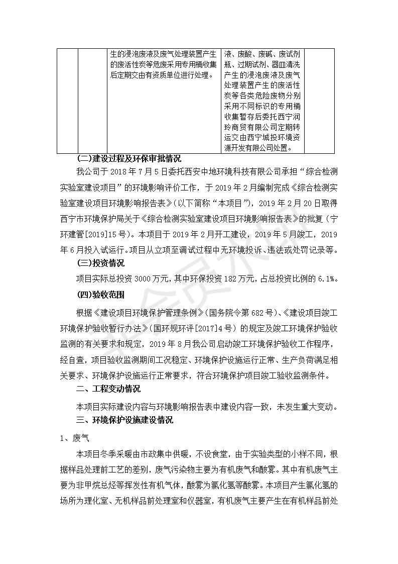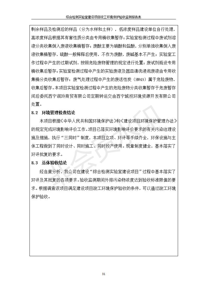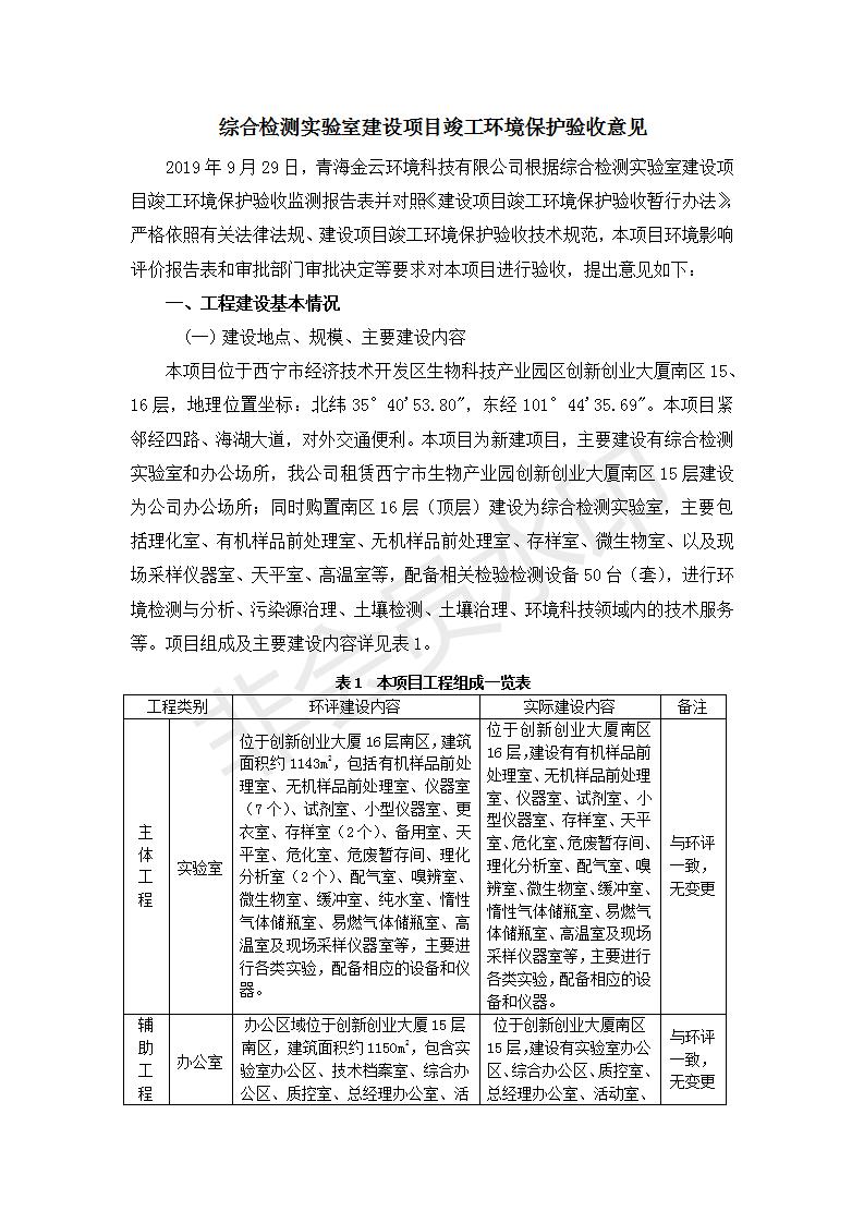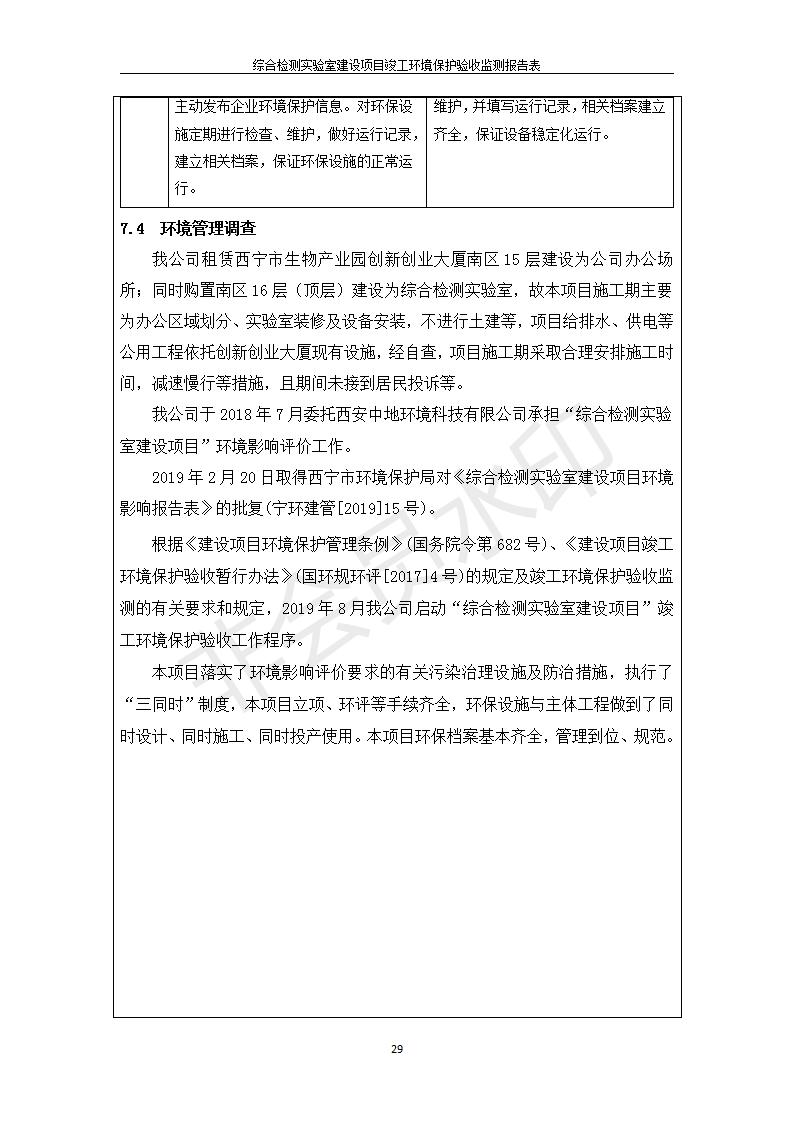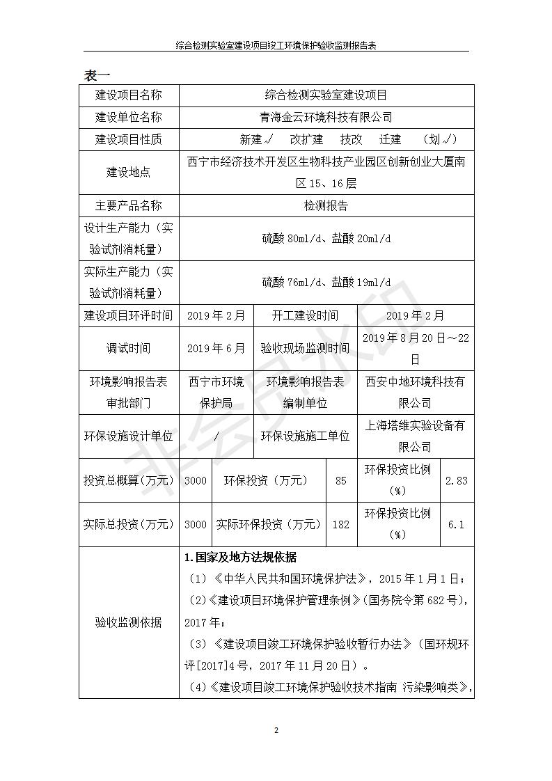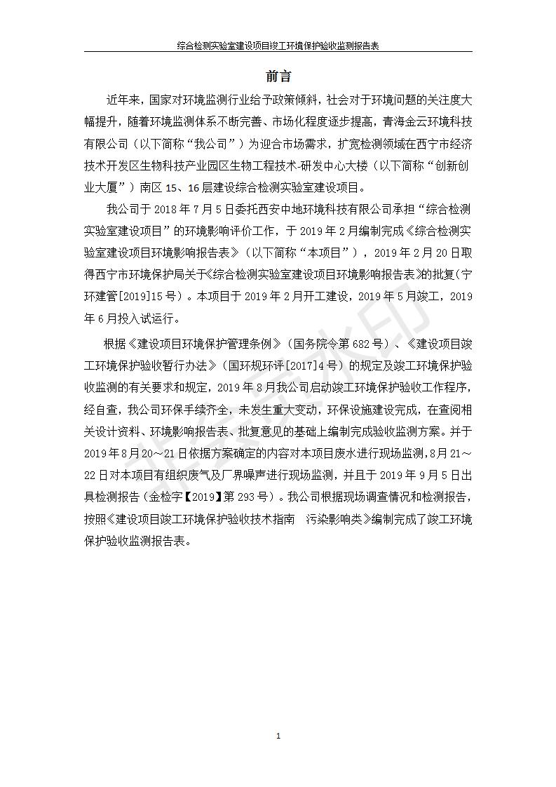 根據(jù)中華人民共和國國務(wù)院令第682號(hào)《國務(wù)院關(guān)于修改〈建設(shè)項(xiàng)目環(huán)境保護(hù)管理?xiàng)l例〉的決定》和《建設(shè)項(xiàng)目竣工環(huán)境保護(hù)驗(yàn)收暫行辦法》(國務(wù)院令682號(hào)),綜合檢測實(shí)驗(yàn)室建設(shè)項(xiàng)目(包括竣工環(huán)境保護(hù)驗(yàn)收監(jiān)測報(bào)告表和驗(yàn)收意見)公示如下。 一、項(xiàng)目名稱:綜合檢測實(shí)驗(yàn)室建設(shè)項(xiàng)目 二、地點(diǎn):西寧市經(jīng)濟(jì)技術(shù)開發(fā)區(qū)生物科技產(chǎn)業(yè)園區(qū)創(chuàng)新創(chuàng)業(yè)大廈南區(qū)15、16層 六、聯(lián)系電話:0971-6515411 七、公示時(shí)間:二〇一九年十一月十九日至二〇一九年十二月十六日 公示期間,對(duì)上述公示內(nèi)容如有異議,請(qǐng)以書面形式反饋,個(gè)人須署真實(shí)姓名,單位須加蓋公章。