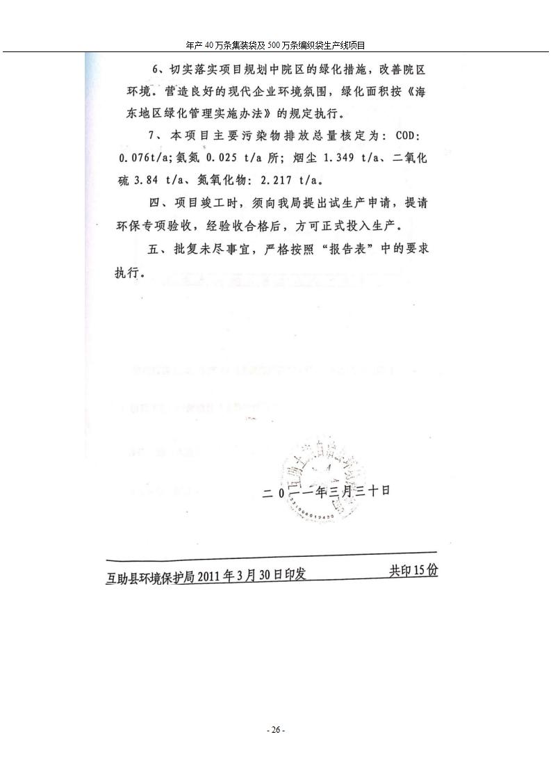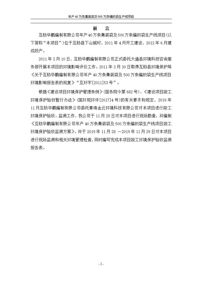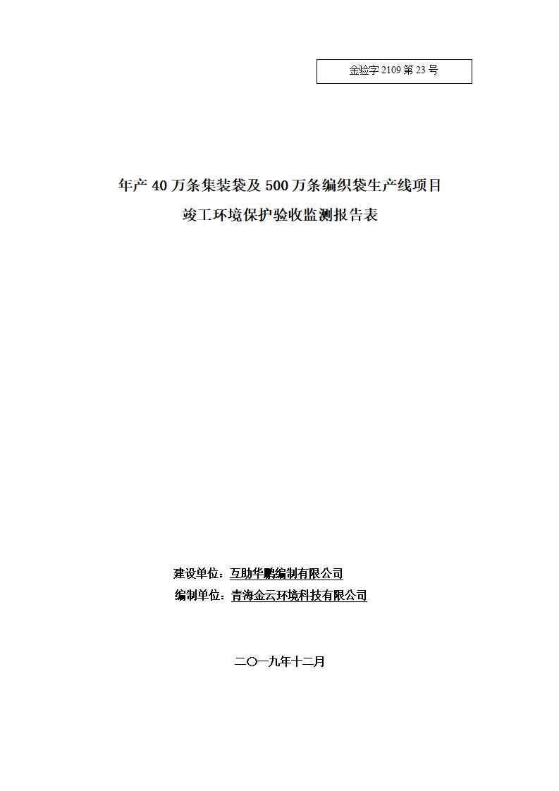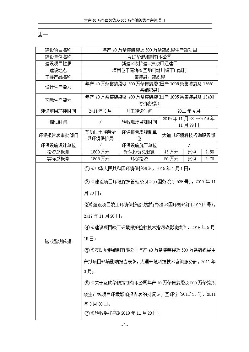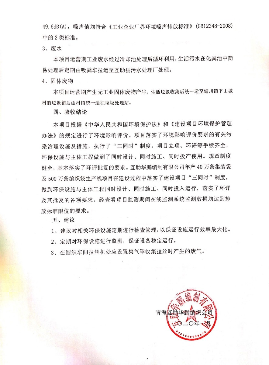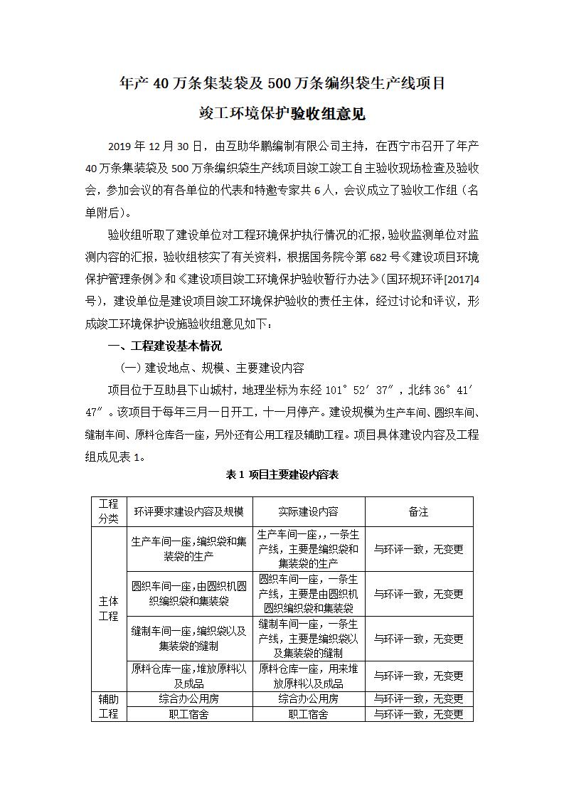 根據(jù)中華人民共和國國務院令第682號《國務院關于修改〈建設項目環(huán)境保護管理條例〉的決定》和《建設項目竣工環(huán)境保護驗收暫行辦法》(國務院令682號),年產40萬條集裝袋及500萬條編織袋生產線項目(包括竣工環(huán)境保護驗收調查表和驗收意見)公示如下。 一、項目名稱: 年產40萬條集裝袋及500萬條編織袋生產線項目 二、地點:互助縣塘川鎮(zhèn)下山城村 五、聯(lián)系人:張工 六、聯(lián)系電話:0971-6515411 七、公示時間:二〇二〇年一月十三日至二〇二〇年二月十二日 公示期間,對上述公示內容如有異議,請以書面形式反饋,個人須署真實姓名,單位須加蓋公章。