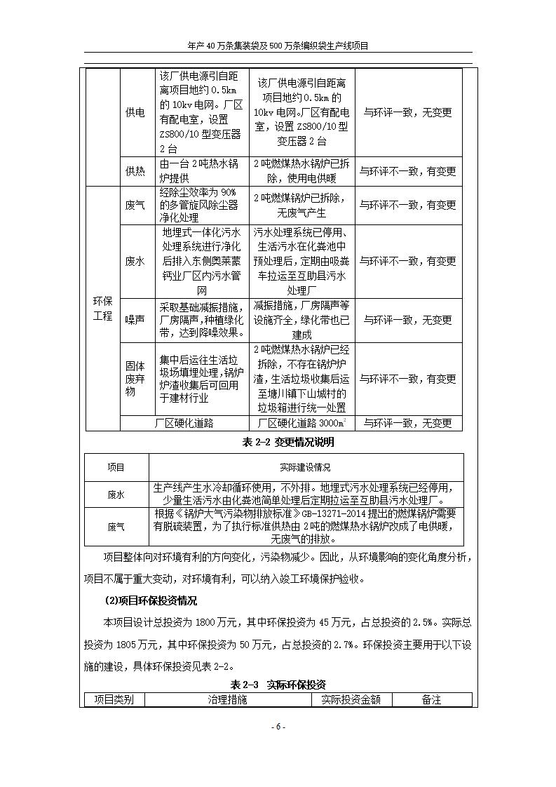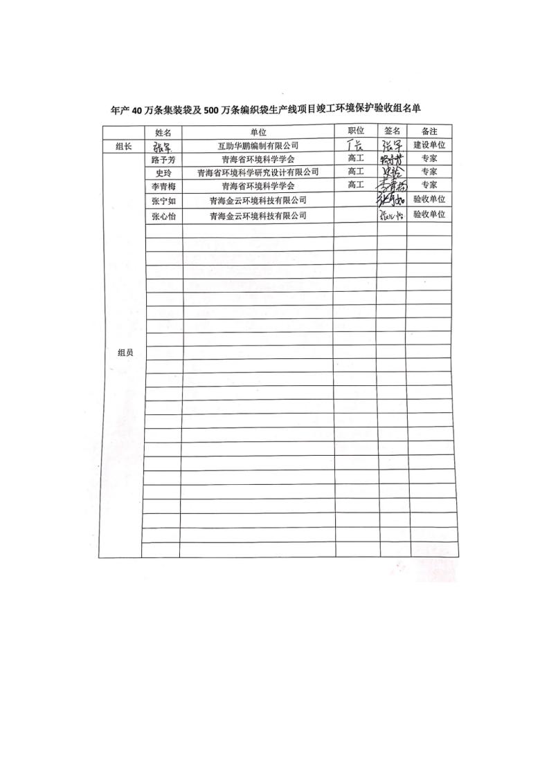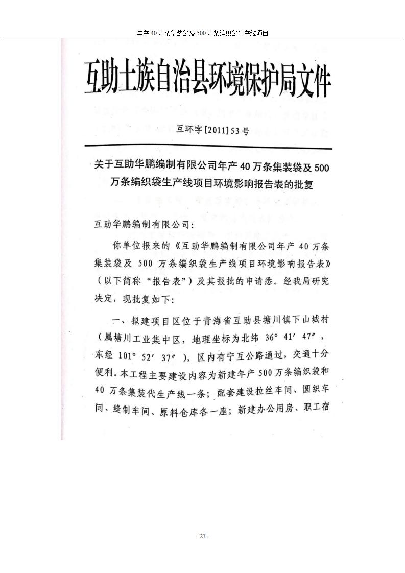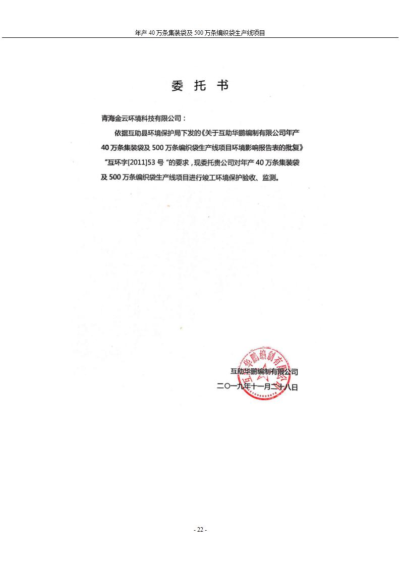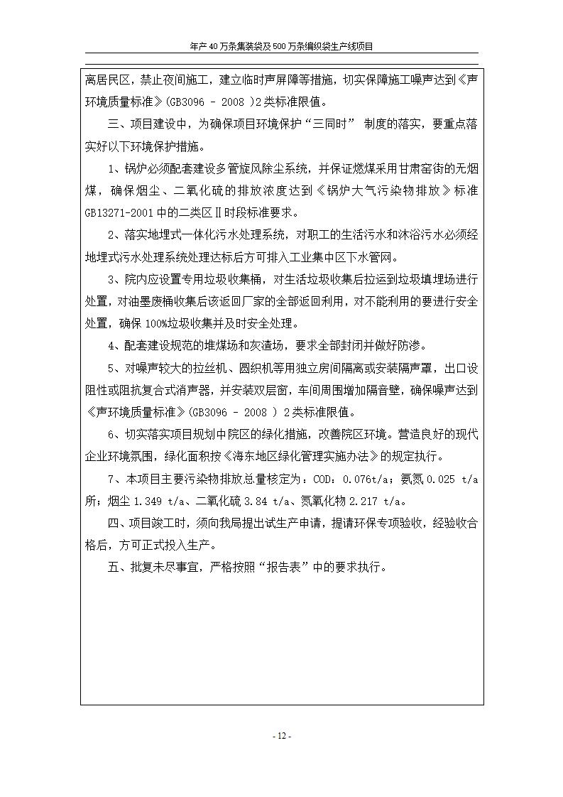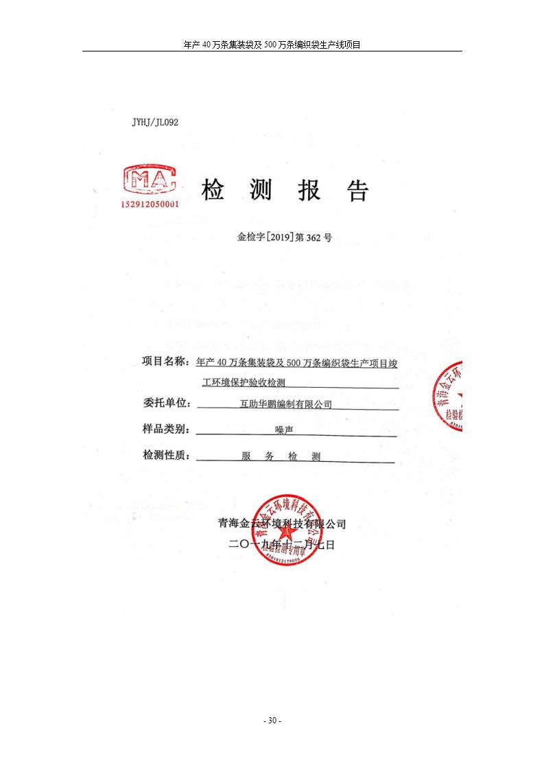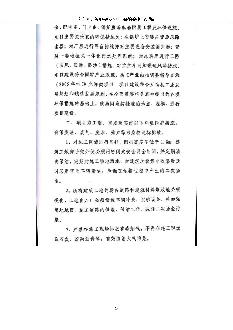根據(jù)中華人民共和國國務院令第682號《國務院關于修改〈建設項目環(huán)境保護管理條例〉的決定》和《建設項目竣工環(huán)境保護驗收暫行辦法》(國務院令682號),年產40萬條集裝袋及500萬條編織袋生產線項目(包括竣工環(huán)境保護驗收調查表和驗收意見)公示如下。 一、項目名稱: 年產40萬條集裝袋及500萬條編織袋生產線項目 二、地點:互助縣塘川鎮(zhèn)下山城村 五、聯(lián)系人:張工 六、聯(lián)系電話:0971-6515411 七、公示時間:二〇二〇年一月十三日至二〇二〇年二月十二日 公示期間,對上述公示內容如有異議,請以書面形式反饋,個人須署真實姓名,單位須加蓋公章。