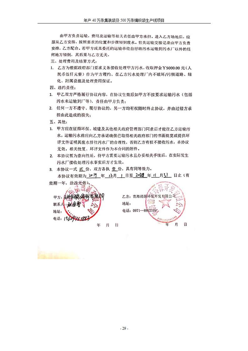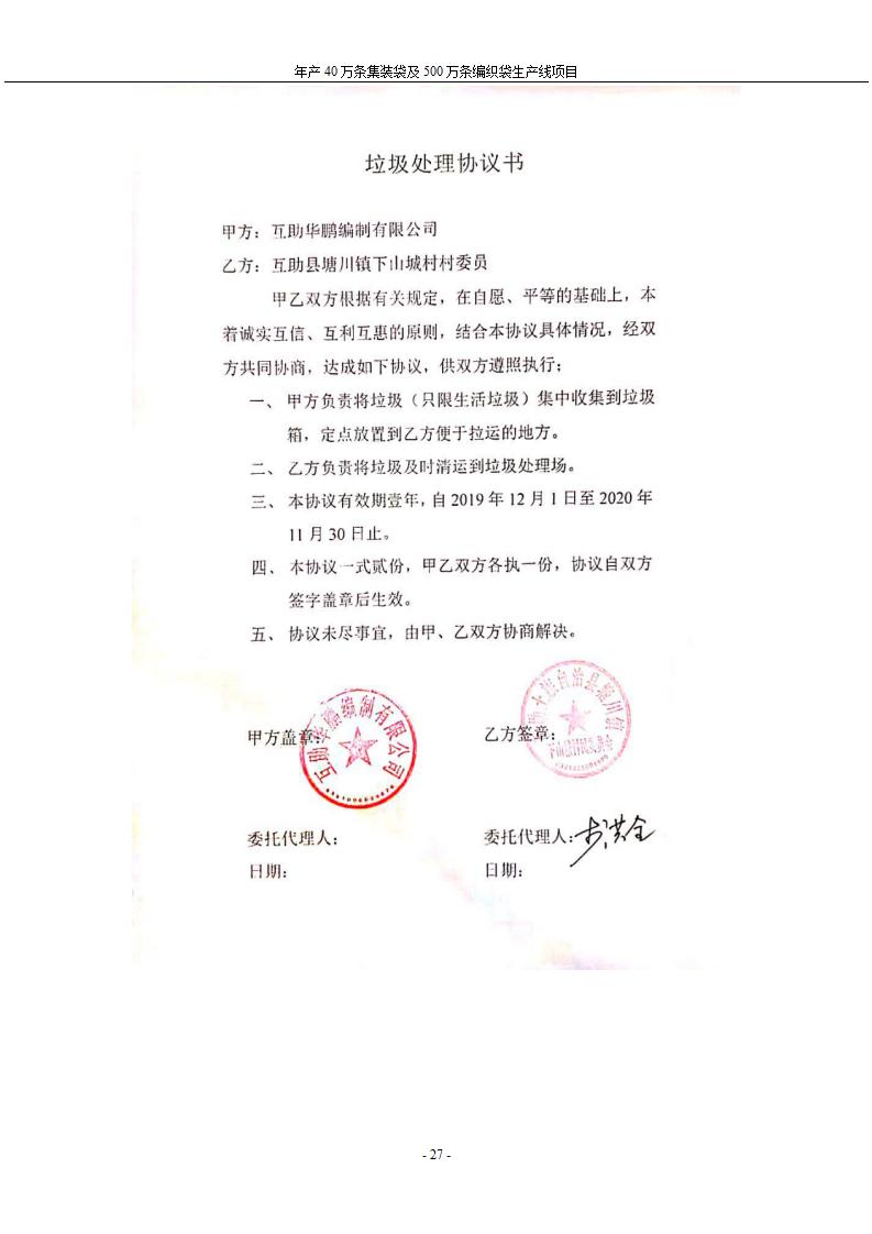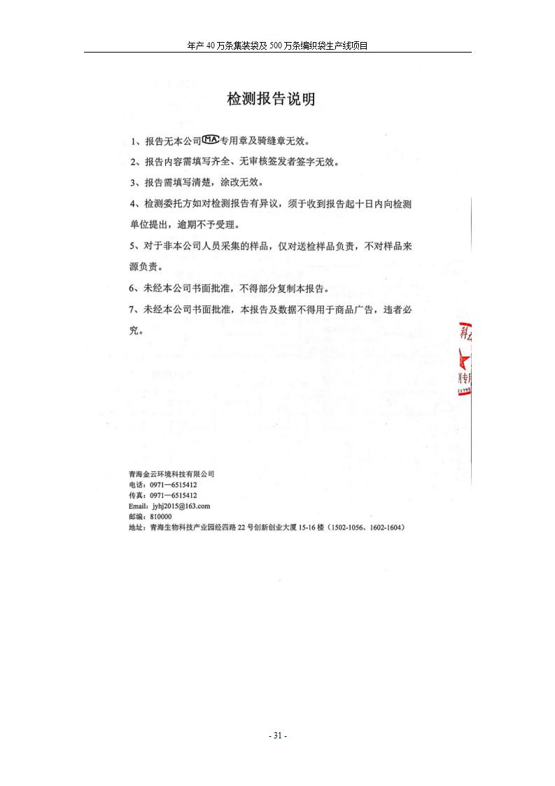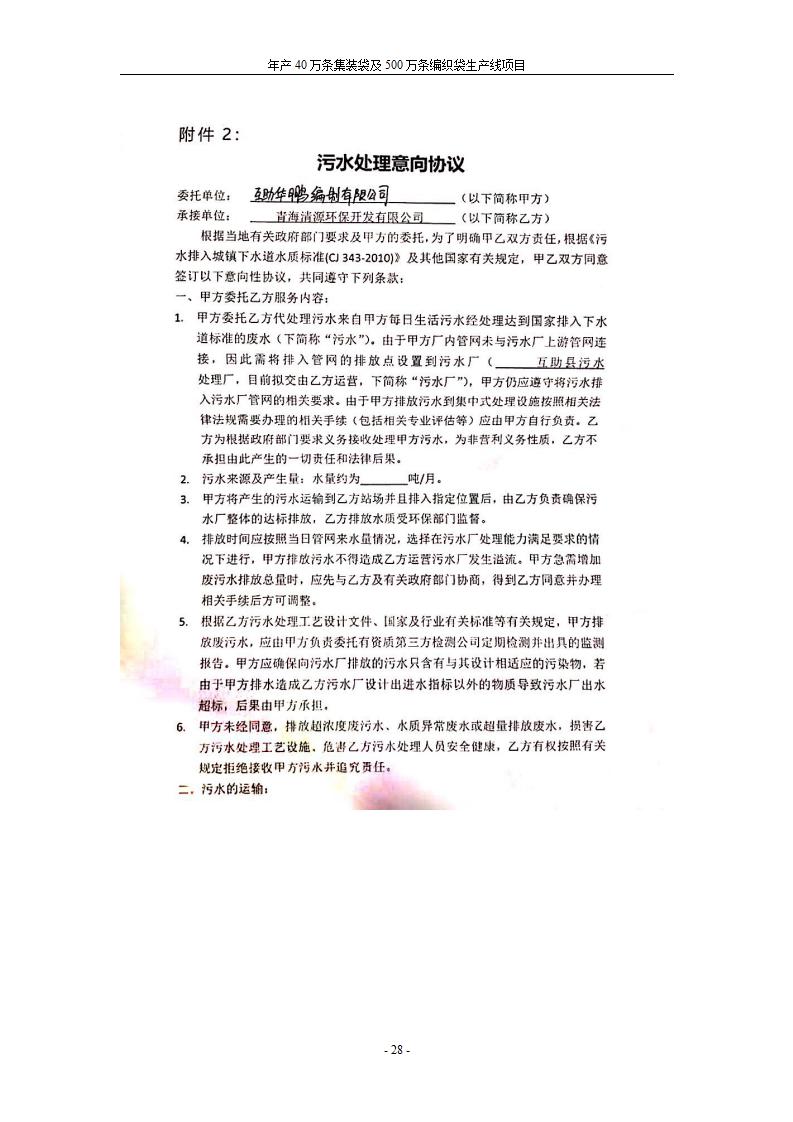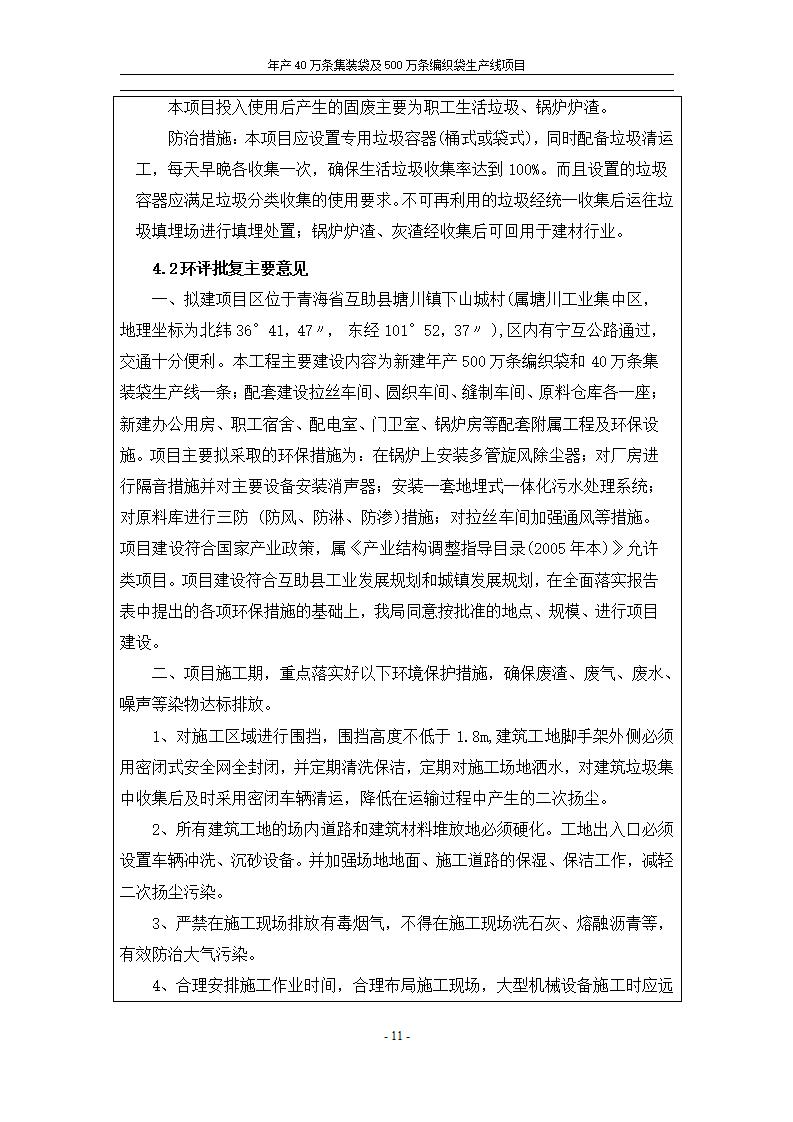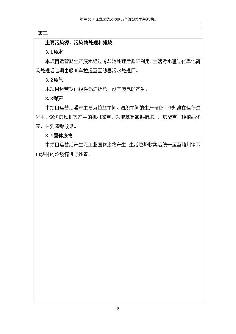 根據(jù)中華人民共和國國務院令第682號《國務院關于修改〈建設項目環(huán)境保護管理條例〉的決定》和《建設項目竣工環(huán)境保護驗收暫行辦法》(國務院令682號),年產40萬條集裝袋及500萬條編織袋生產線項目(包括竣工環(huán)境保護驗收調查表和驗收意見)公示如下。 一、項目名稱: 年產40萬條集裝袋及500萬條編織袋生產線項目 二、地點:互助縣塘川鎮(zhèn)下山城村 五、聯(lián)系人:張工 六、聯(lián)系電話:0971-6515411 七、公示時間:二〇二〇年一月十三日至二〇二〇年二月十二日 公示期間,對上述公示內容如有異議,請以書面形式反饋,個人須署真實姓名,單位須加蓋公章。