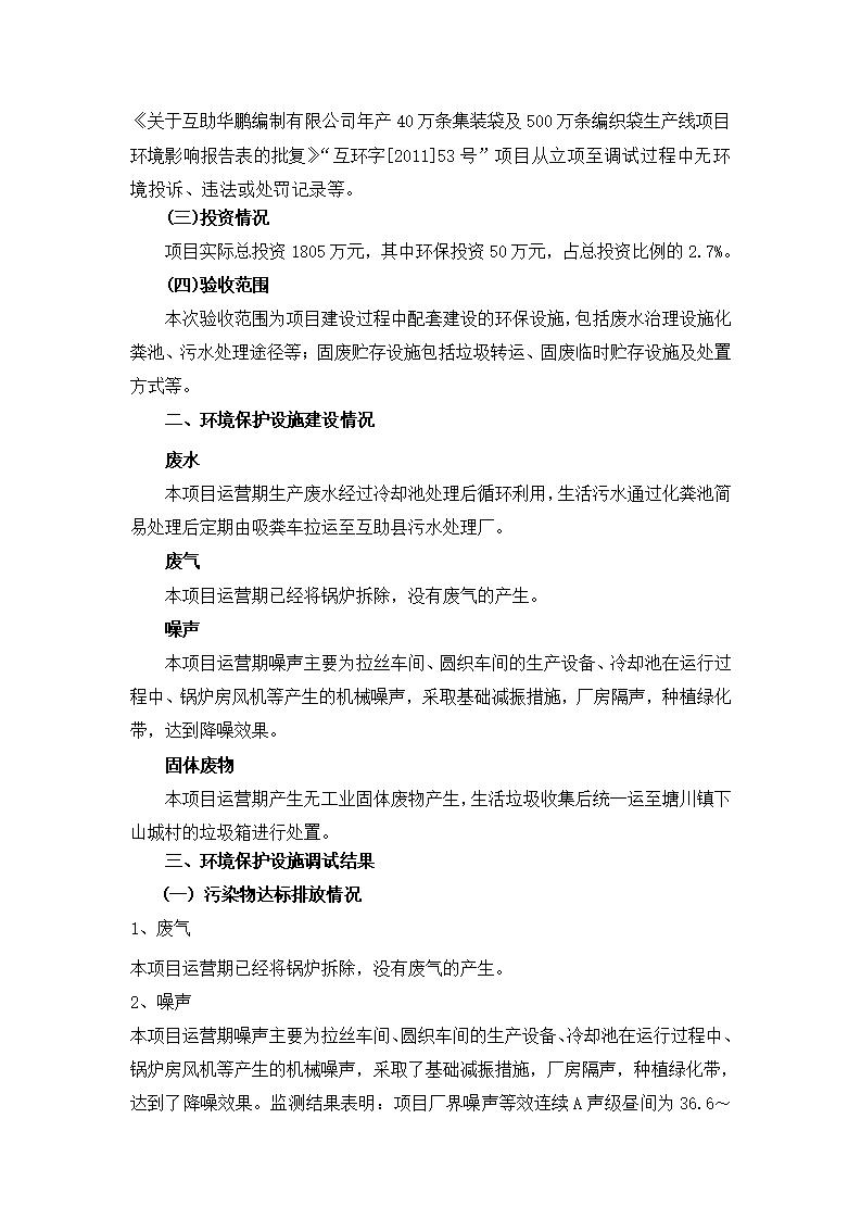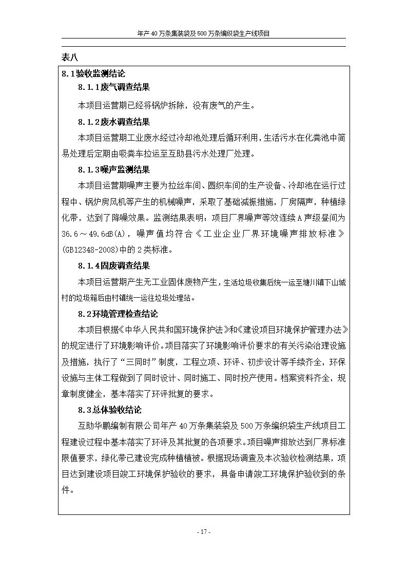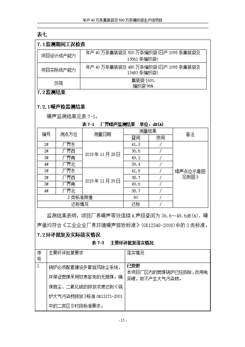 年產40萬條集裝袋及500萬條編織袋生產線項目竣工環(huán)境保護驗收監(jiān)測報告表公示發(fā)布日期:(2020-1-13) 點擊次數(shù):2402 |