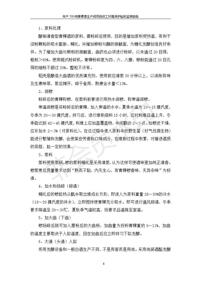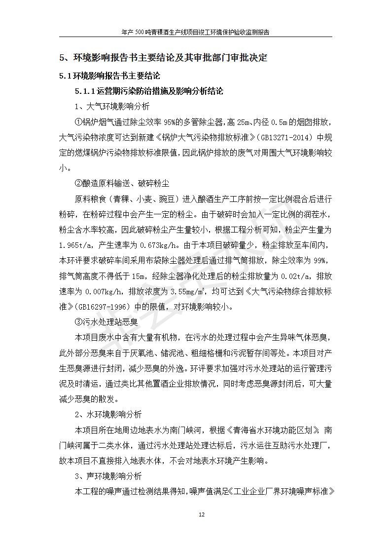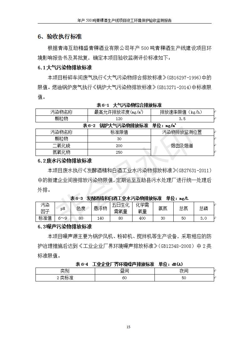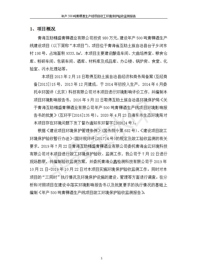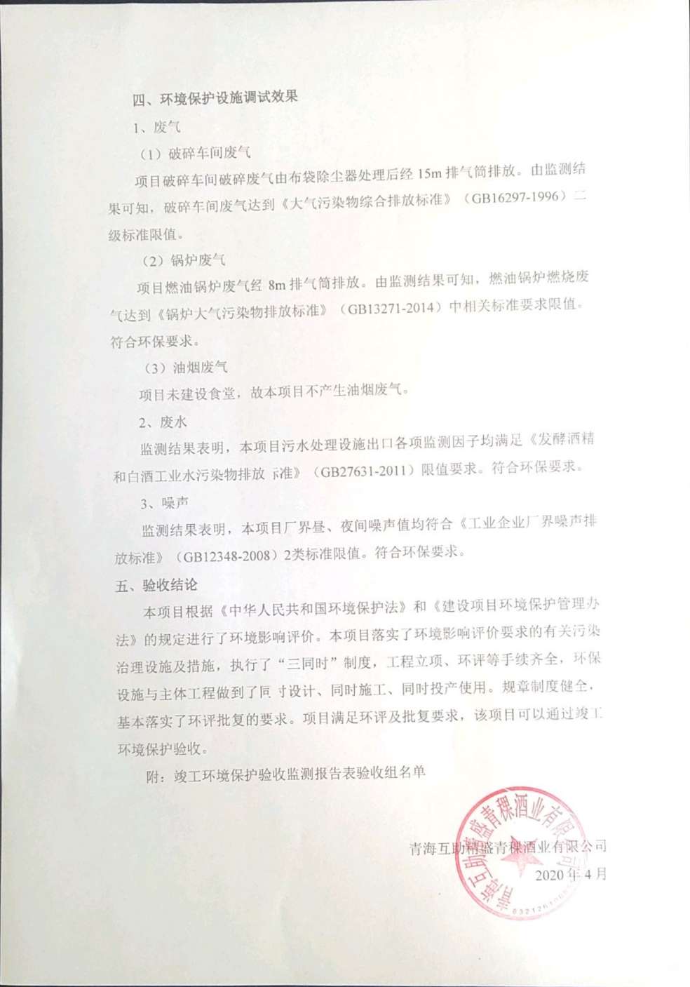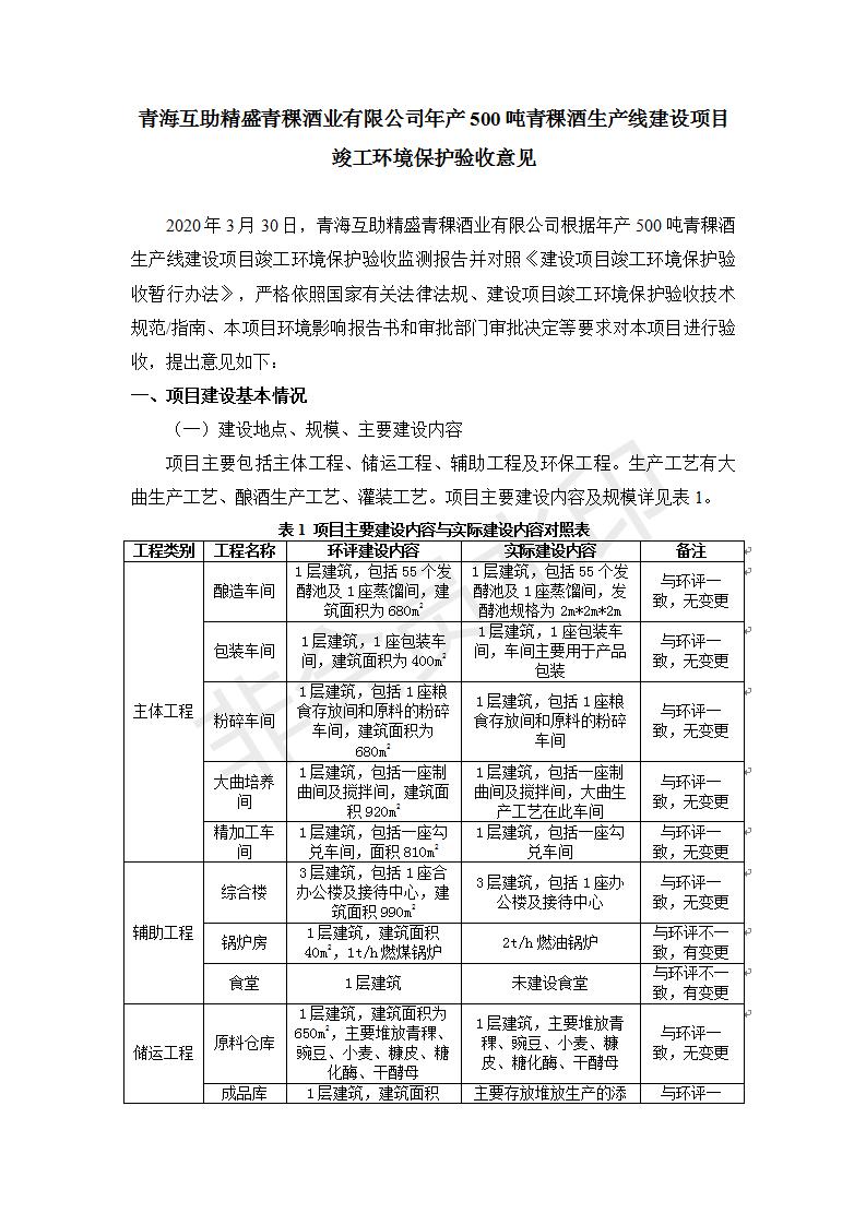 根據(jù)中華人民共和國國務(wù)院令第682號《國務(wù)院關(guān)于修改〈建設(shè)項(xiàng)目環(huán)境保護(hù)管理?xiàng)l例〉的決定》和《建設(shè)項(xiàng)目竣工環(huán)境保護(hù)驗(yàn)收暫行辦法》(國務(wù)院令682號),綜合檢測實(shí)驗(yàn)室建設(shè)項(xiàng)目(包括竣工環(huán)境保護(hù)驗(yàn)收監(jiān)測報告表和驗(yàn)收意見)公示如下。 一、項(xiàng)目名稱:青;ブ⑶囡茦I(yè)有限公司年產(chǎn)500噸青稞酒業(yè)生產(chǎn)線建設(shè)項(xiàng)目 二、地點(diǎn):青海省海東市互助土族自治縣臺子鄉(xiāng)河?xùn)|村198號