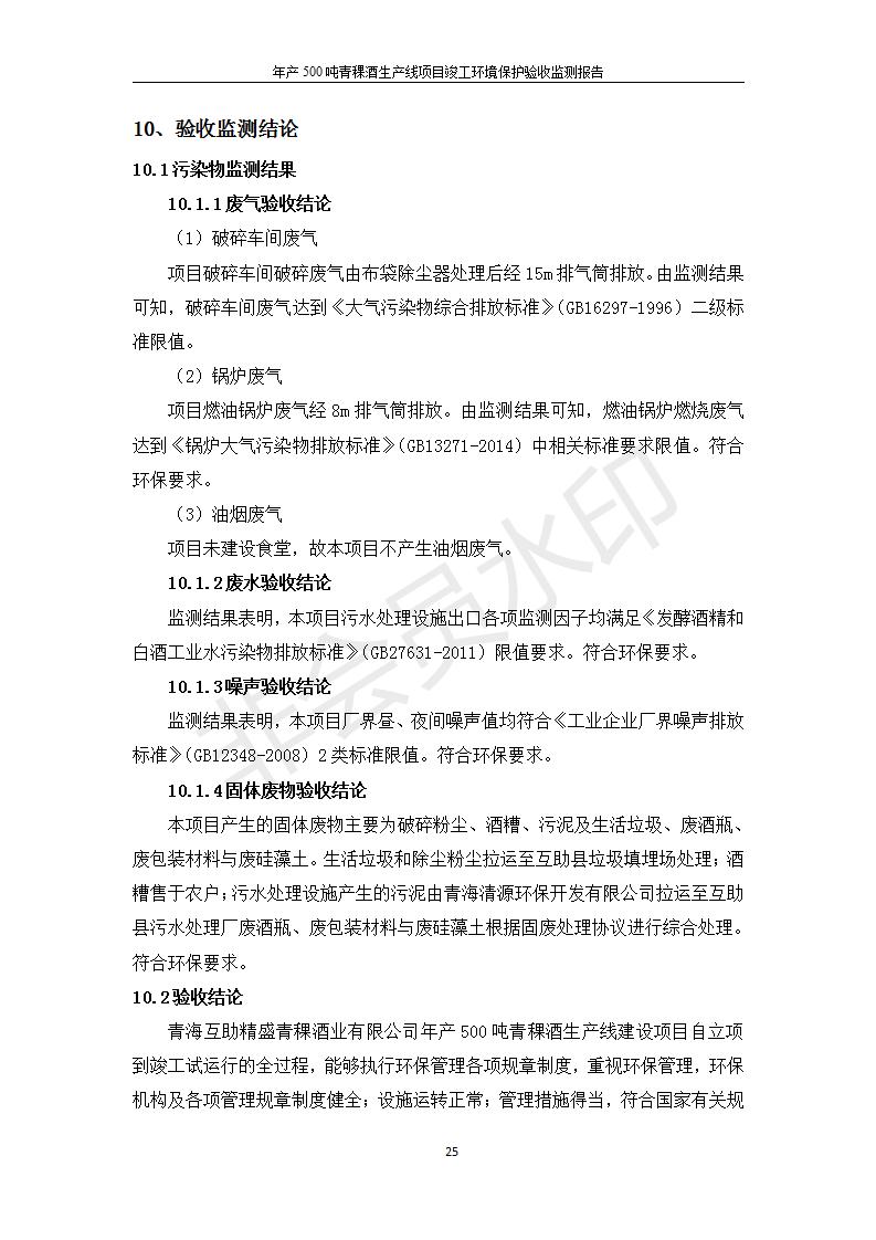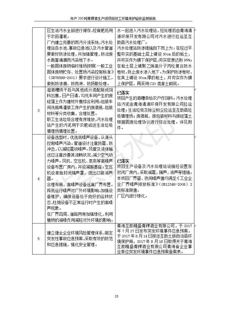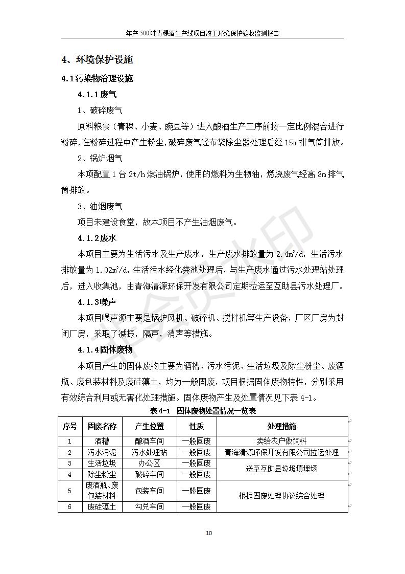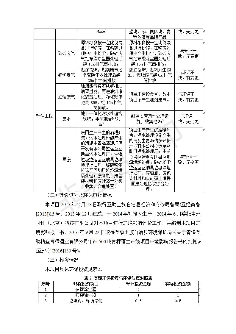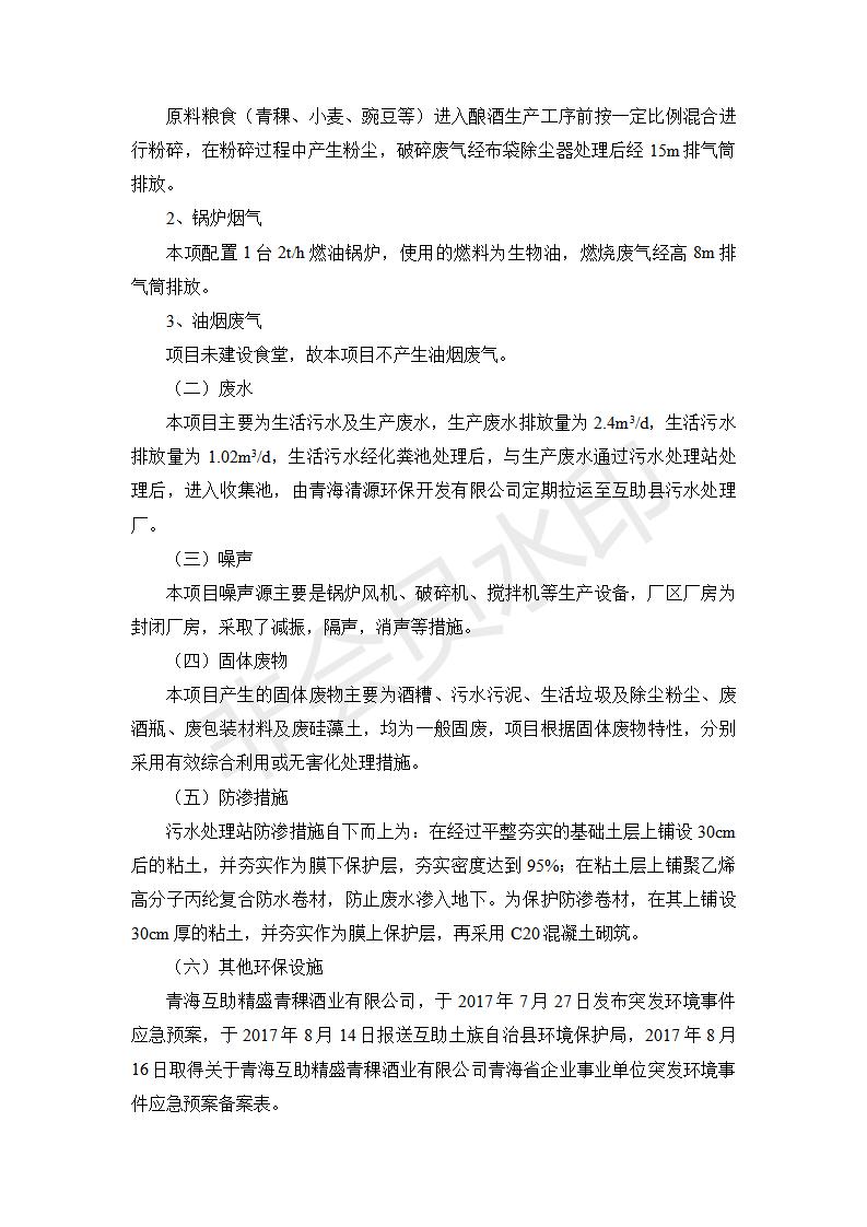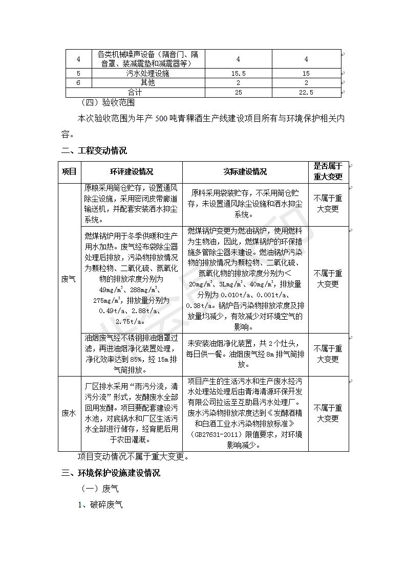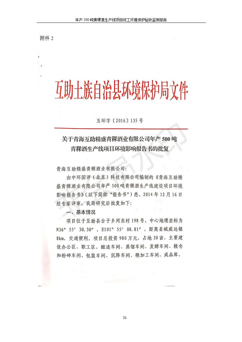 根據(jù)中華人民共和國國務(wù)院令第682號《國務(wù)院關(guān)于修改〈建設(shè)項(xiàng)目環(huán)境保護(hù)管理?xiàng)l例〉的決定》和《建設(shè)項(xiàng)目竣工環(huán)境保護(hù)驗(yàn)收暫行辦法》(國務(wù)院令682號),綜合檢測實(shí)驗(yàn)室建設(shè)項(xiàng)目(包括竣工環(huán)境保護(hù)驗(yàn)收監(jiān)測報告表和驗(yàn)收意見)公示如下。 一、項(xiàng)目名稱:青;ブ⑶囡茦I(yè)有限公司年產(chǎn)500噸青稞酒業(yè)生產(chǎn)線建設(shè)項(xiàng)目 二、地點(diǎn):青海省海東市互助土族自治縣臺子鄉(xiāng)河?xùn)|村198號