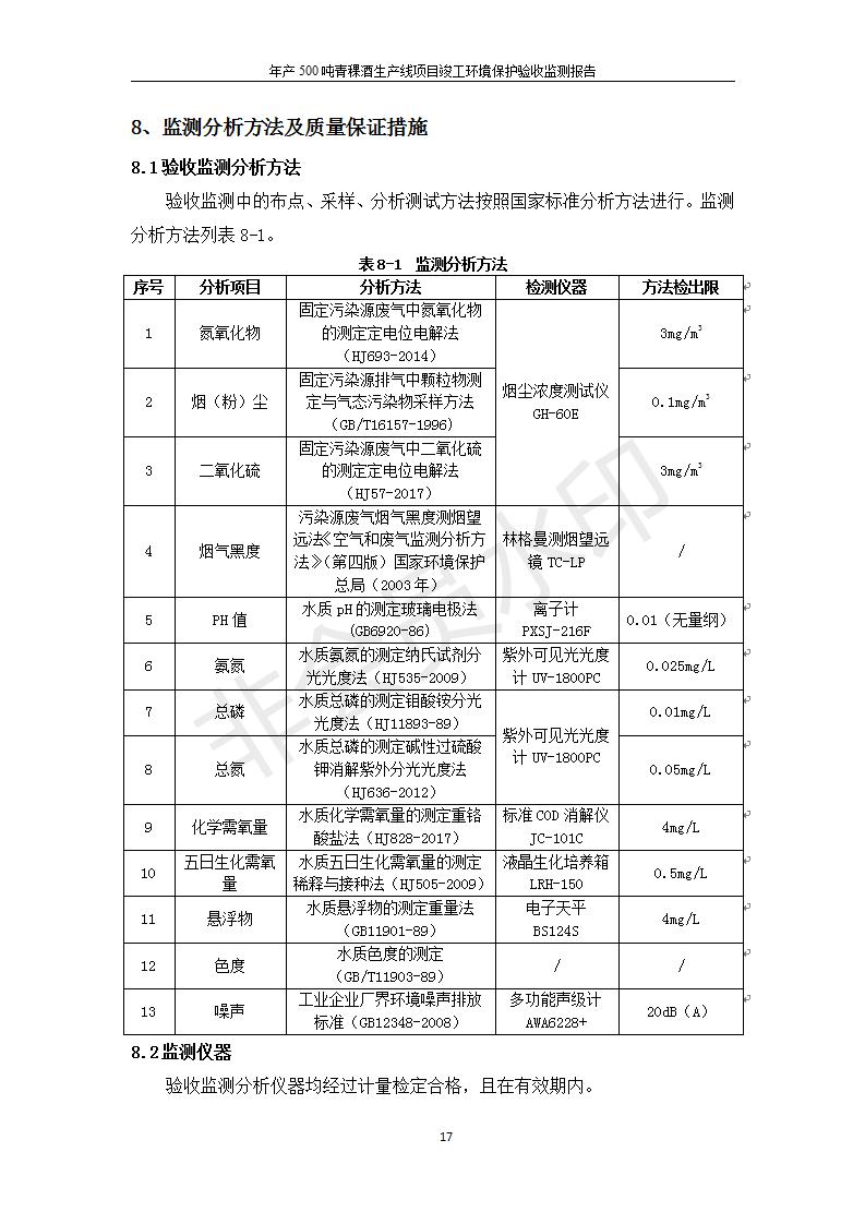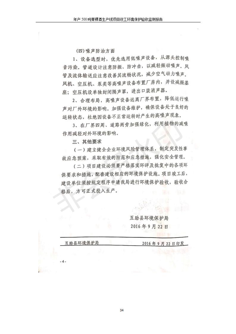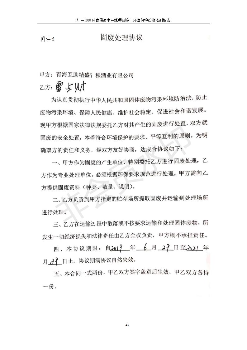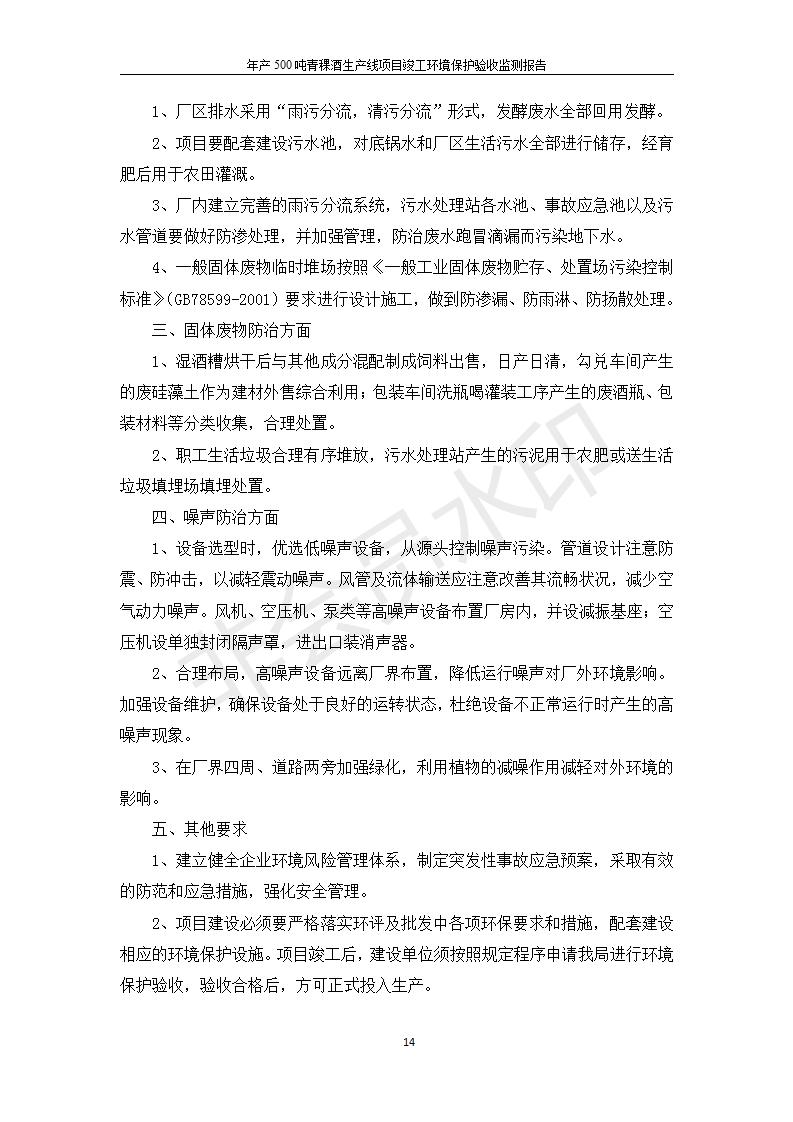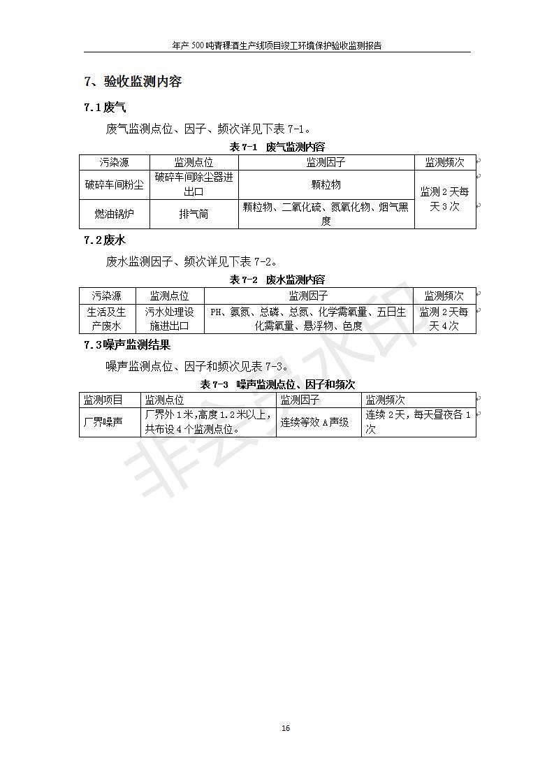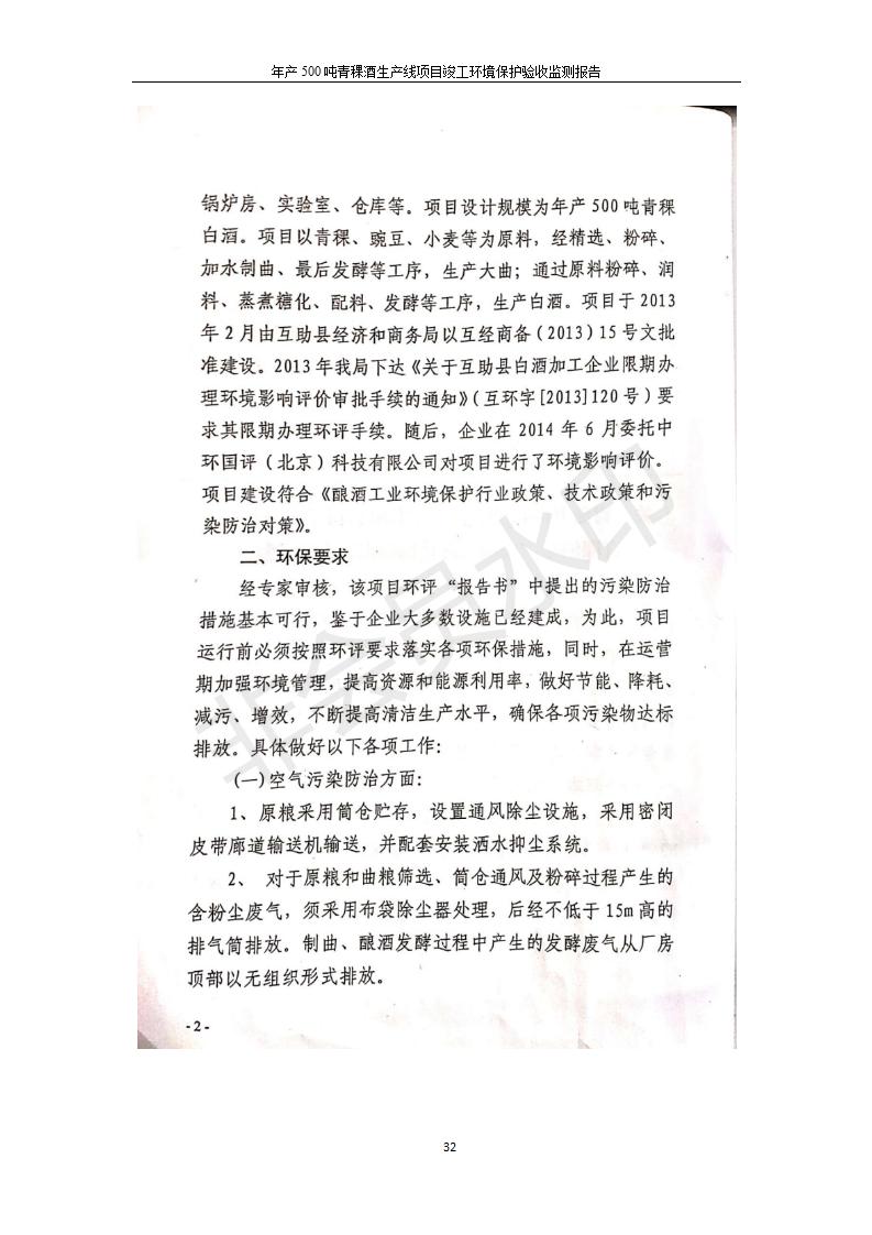 根據(jù)中華人民共和國國務(wù)院令第682號《國務(wù)院關(guān)于修改〈建設(shè)項(xiàng)目環(huán)境保護(hù)管理?xiàng)l例〉的決定》和《建設(shè)項(xiàng)目竣工環(huán)境保護(hù)驗(yàn)收暫行辦法》(國務(wù)院令682號),綜合檢測實(shí)驗(yàn)室建設(shè)項(xiàng)目(包括竣工環(huán)境保護(hù)驗(yàn)收監(jiān)測報告表和驗(yàn)收意見)公示如下。 一、項(xiàng)目名稱:青;ブ⑶囡茦I(yè)有限公司年產(chǎn)500噸青稞酒業(yè)生產(chǎn)線建設(shè)項(xiàng)目 二、地點(diǎn):青海省海東市互助土族自治縣臺子鄉(xiāng)河?xùn)|村198號